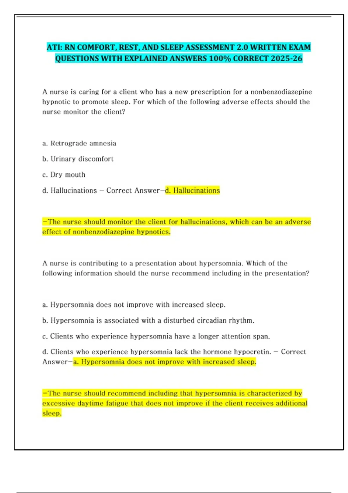 ATI: RN COMFORT, REST, AND SLEEP ASSESSMENT 2.0 WRITTEN EXAM QUESTIONS WITH EXPLAINED ANSWERS 100% CORRECT 2025-26