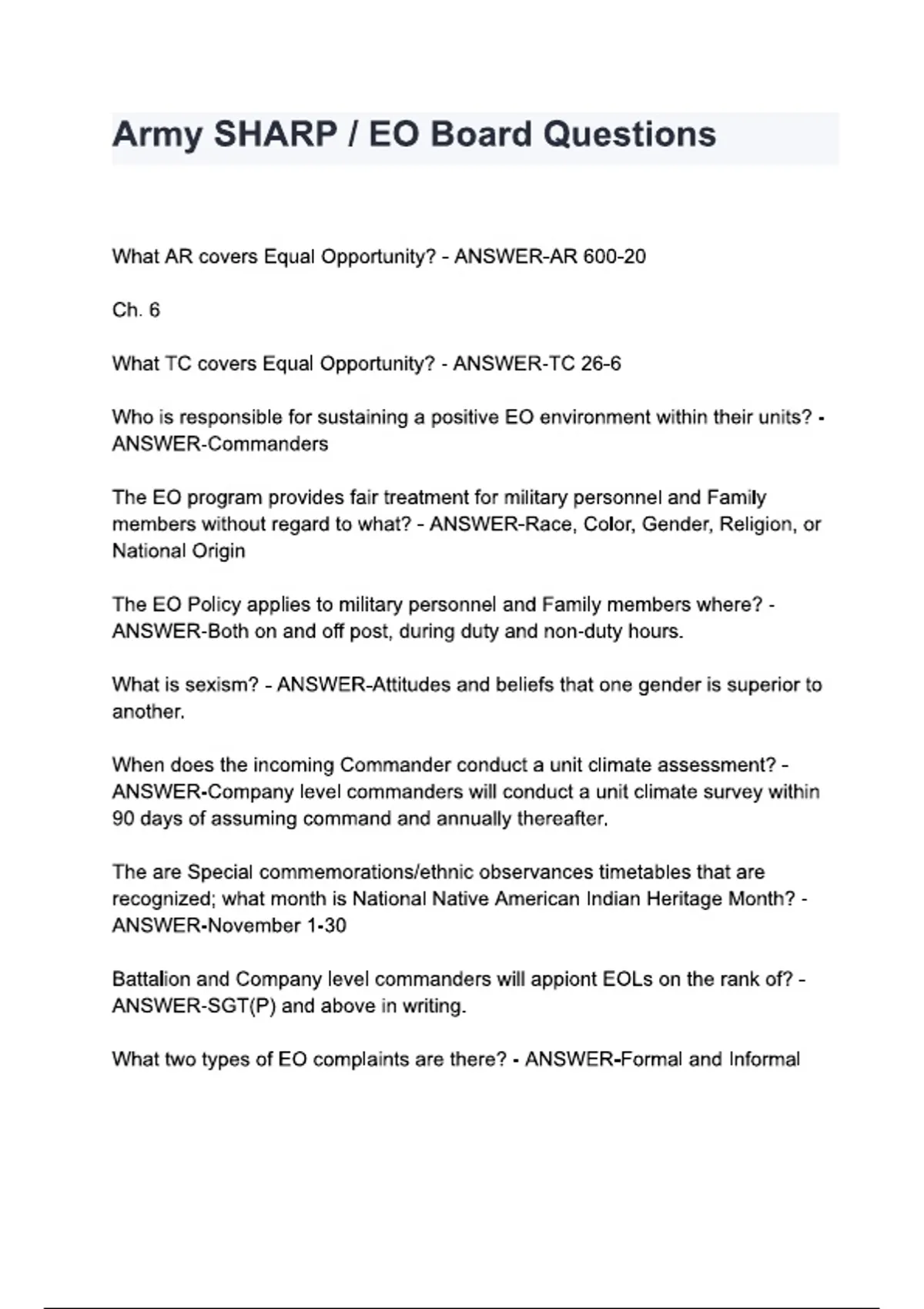 Army SHARP-EO Board Questions and answers