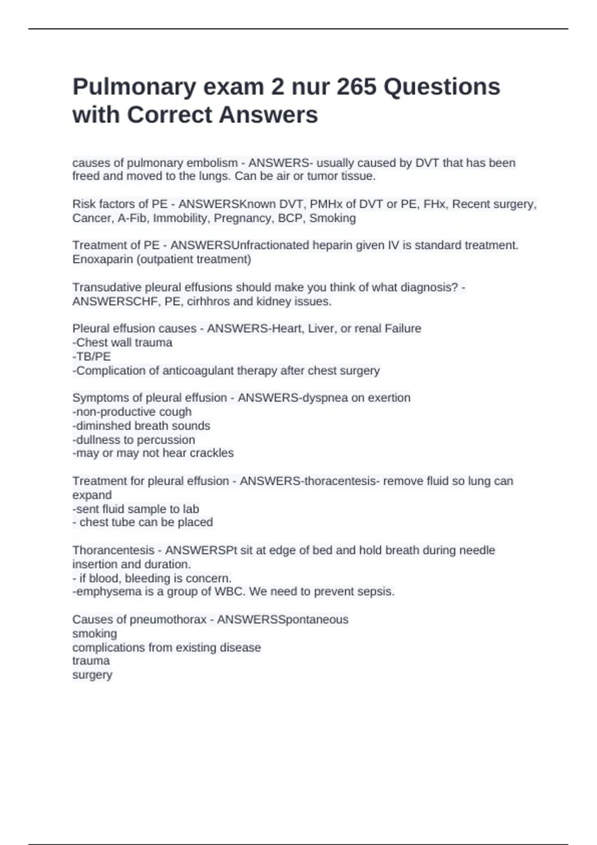 Treatment for pleural effusion - ANSWERS-thoracentesis- remove fluid so lung can