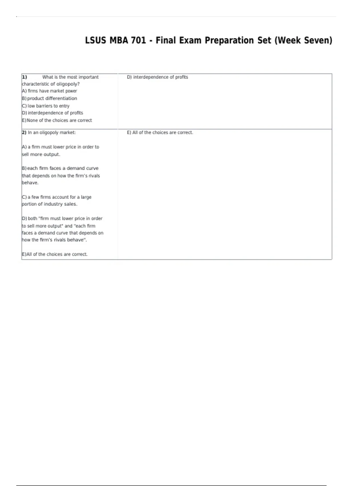 LSUS MBA 701 - Final Exam Preparation Set (Week Seven)
