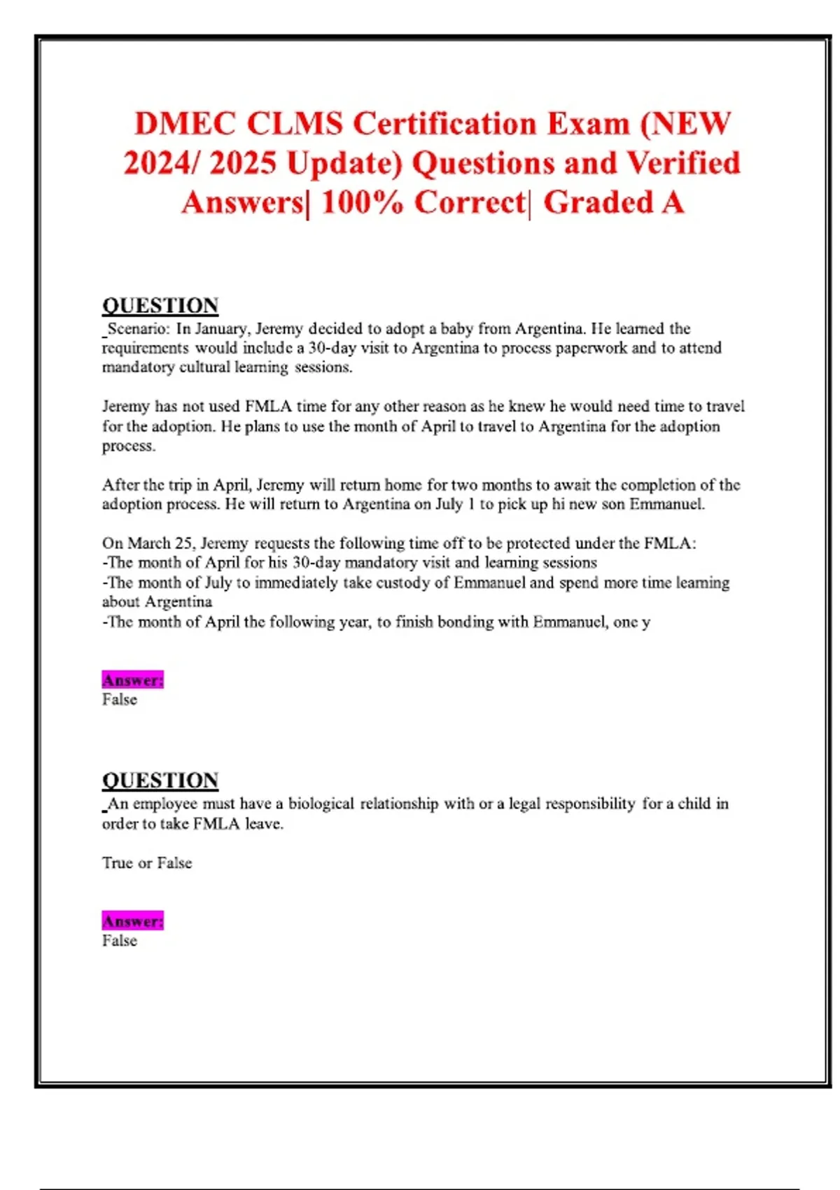 DMEC CLMS Certification Exam (NEW Update) Questions and Verified Answers, 100- Correct-