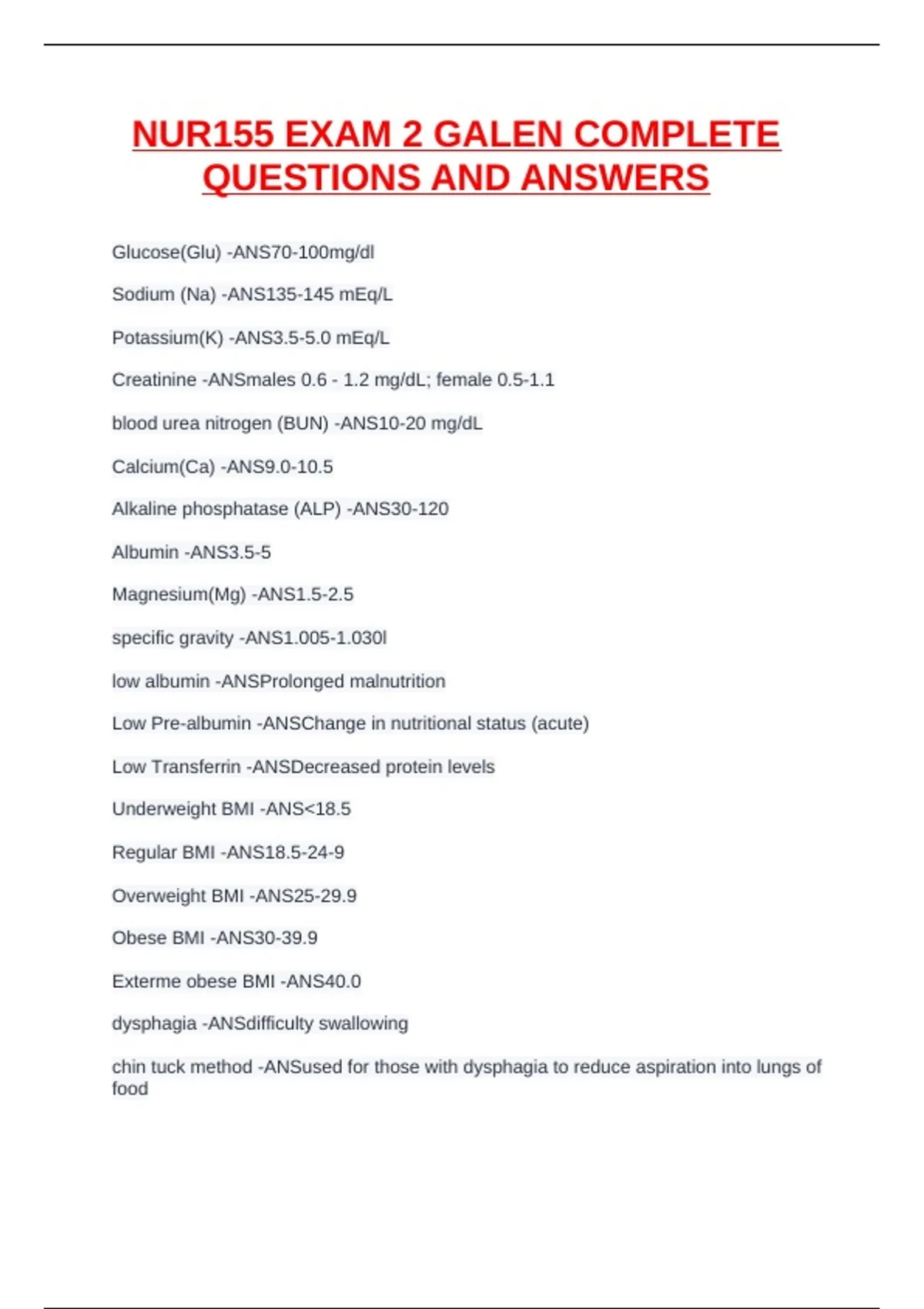 NUR155 EXAM 2 GALEN COMPLETE QUESTIONS AND ANSWERS