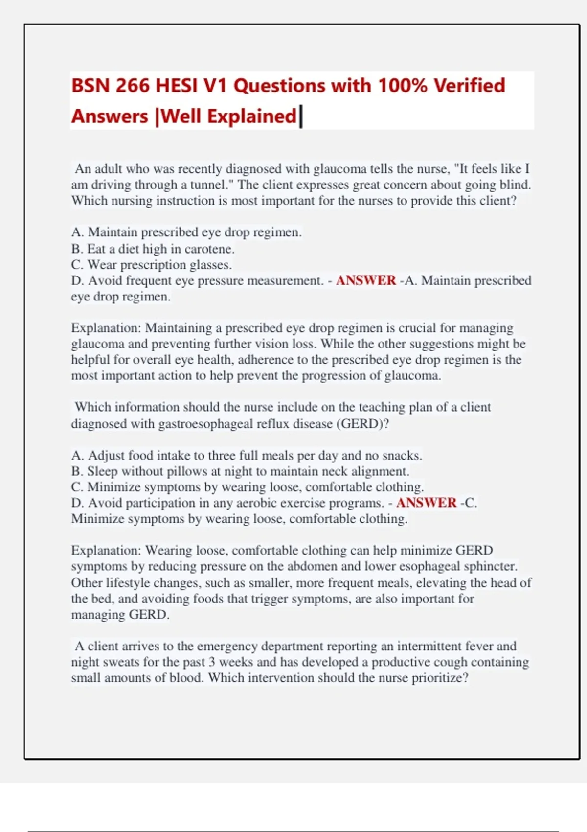 BSN 266 HESI V1 Questions with 100% Verified Answers |Well Explained| An adult who was recently diagnosed with glaucoma tells the nurse, "It feels like I am driving through a tunnel." The client expresses great concern about going blind. Which nursing instruction is most important for the nurses to provide this client? A. Maintain prescribed eye drop regimen. B. Eat a diet high in carotene. C. Wear prescription glasses. D. Avoid frequent eye pressure measurement. - ANSWER -A. Maintain prescribed eye drop regimen. Explanation: Maintaining a prescribed eye drop regimen is crucial for managing glaucoma and preventing further vision loss. While the other suggestions might be helpful for overall eye health, adherence to the prescribed eye drop regimen is the most important action to help prevent the progression of glaucoma. Which information should the nurse include on the teaching plan of a client diagnosed with gastroesophageal reflux disease (GERD)? A. Adjust food intake to three full meals per day and no snacks. B. Sleep without pillows at night to maintain neck alignment. C. Minimize symptoms by wearing loose, comfortable clothing. D. Avoid participation in any aerobic exercise programs. - ANSWER -C. Minimize symptoms by wearing loose, comfortable clothing. Explanation: Wearing loose, comfortable clothing can help minimize GERD symptoms by reducing pressure on the abdomen and lower esophageal sphincter. Other lifestyle changes, such as smaller, more frequent meals, elevating the head of the bed, and avoiding foods that trigger symptoms, are also important for managing GERD. A client arrives to the emergency department reporting an intermittent fever and night sweats for the past 3 weeks and has developed a productive cough containing small amounts of blood. Which intervention should the nurse prioritize? A. Move into airborne isolation. B. Collect specimens for blood cultures. C. Arrange transport for radiographic imaging. D. Obtain a sputum sample. - ANSWER -A. Move into airborne isolation. Explanation: The client's symptoms (intermittent fever, night sweats, productive cough with blood) are suggestive of tuberculosis (TB). The nurse should prioritize placing the client in airborne isolation to prevent the potential spread of TB to others while awaiting further assessment and testing. A client receives a prescription for 1 liter of Ringer's intravenously to be infused over 6 hours. How many mL/hr should the nurse program the infusion pump to deliver? (Enter numerical value only. If rounding is required, round to the nearest whole number.) ________ mL - ANSWER -167 A client with eczema is applying 10% urea cream onto the affected skin areas. Which finding reflects the expected therapeutic response? A. Hydration of affected dry skin areas. B. Reduced pain in eczematous areas. C. Decreased weeping of ulcerations in affected areas. D. Healing with a return to normal skin appearance. - ANSWER -A. Hydration of affected dry skin areas. Explanation: Urea cream is a moisturizing agent that helps hydrate and soften dry, rough skin in clients with eczema. The expected therapeutic response would be hydration of the affected dry skin areas. While the cream may also help alleviate some symptoms, such as itching or pain, its primary purpose is to moisturize the skin. The nurse is caring for a client with chronic pancreatitis who reports persistent gnawing abdominal pain. To help the client manage the pain, which assessment data is most improtant for the nurse ot obtain? A. Activity level of bowel sounds. B. Eating patterns of dietary restrictions. C. Level and amount of physical activity. D. Color and consistency of feces. - ANSWER -B. Eating patterns of dietary restrictions. Explanation: In clients with chronic pancreatitis, the nurse should assess eating patterns of dietary intake to help manage persistent abdominal pain. The pain is often related to the type and amount of food consumed, and adjusting the diet can help alleviate discomfort. Clients are usually advised to eat smaller, more frequent meals, and avoid high-fat foods. A client with hyperparathyroidism reports a sudden onset of severe flank pain. Which intervention should the nurse include in the client's plan of care? A. Implement seizure precautions. B. Initiate cardiac telemetry. C. Administer a PRN dose of a laxative. D. Begin straining all urine. - ANSWER -D. Begin straining all urine. Explanation: Sudden onset of severe flank pain in a client with hyperparathyroidism may indicate the presence of kidney stones. The nurse should include straining all urine in the client's plan of care to collect any passed stones for analysis and to monitor the progress of stone passage. After falling down the basement steps, a client is brought to the emergency room. X-ray confirms that the client's right leg is fractured. Following application of a leg cast, which assessment finding warrants immediate intervention by the nurse? A. Circumferential edema of right foot. B. Complaint of throbbing right leg pain. C. Right foot pale with sluggish capillary refill. D. Increased temperature to lower extremity. - ANSWER -C. Right foot pale with sluggish capillary refill. Explanation: A pale right foot with sluggish capillary refill following the application of a leg cast may indicate compromised blood flow to the extremity, which requires immediate intervention by the nurse. The other findings are expected after a fracture and cast application, but do not warrant immediate intervention. An older adult client with a long history of chronic obstructive pulmonary disease (COPD) is admitted with progressive shortness of breath and a persistent cough.