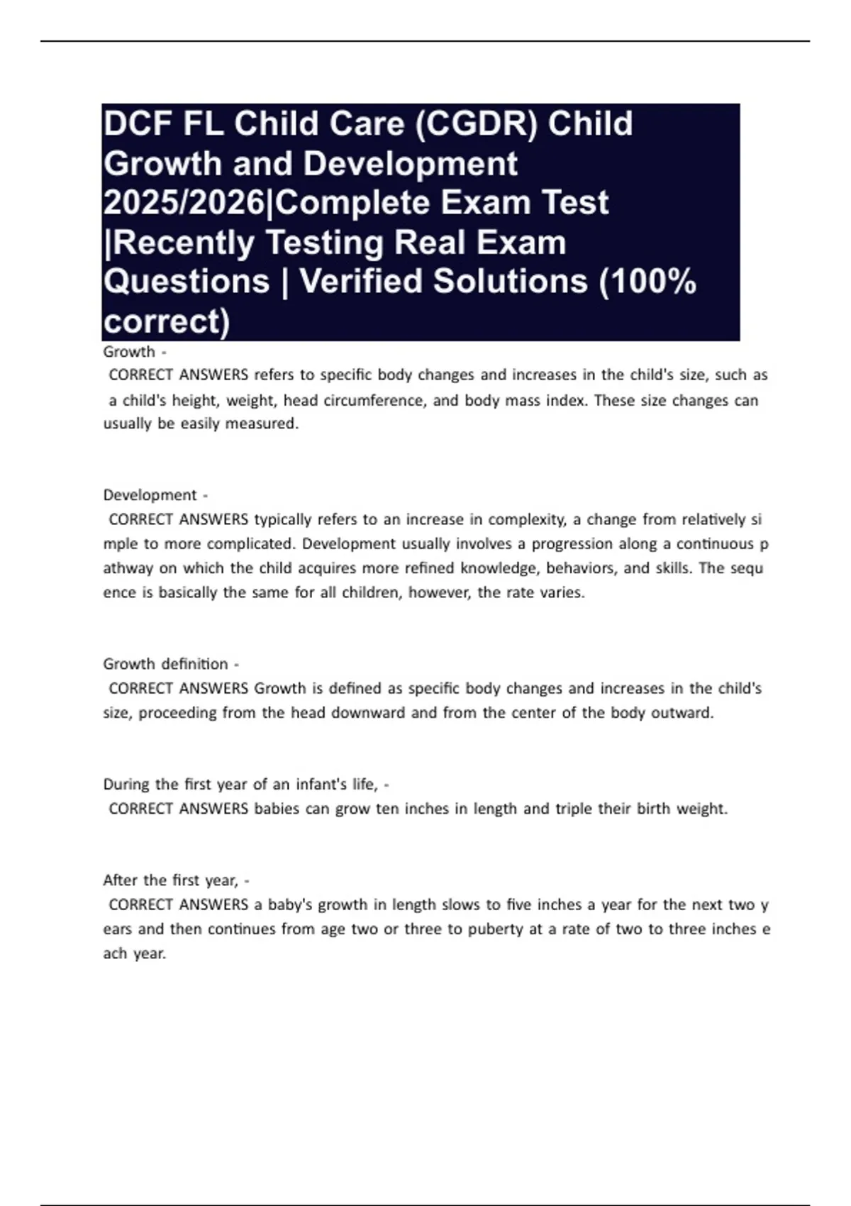 DCF FL Child Care (CGDR) Child Growth and Development 2025/2026|Complete Exam Test |Recently Testing Real Exam Questions | Verified Solutions (100% correct)