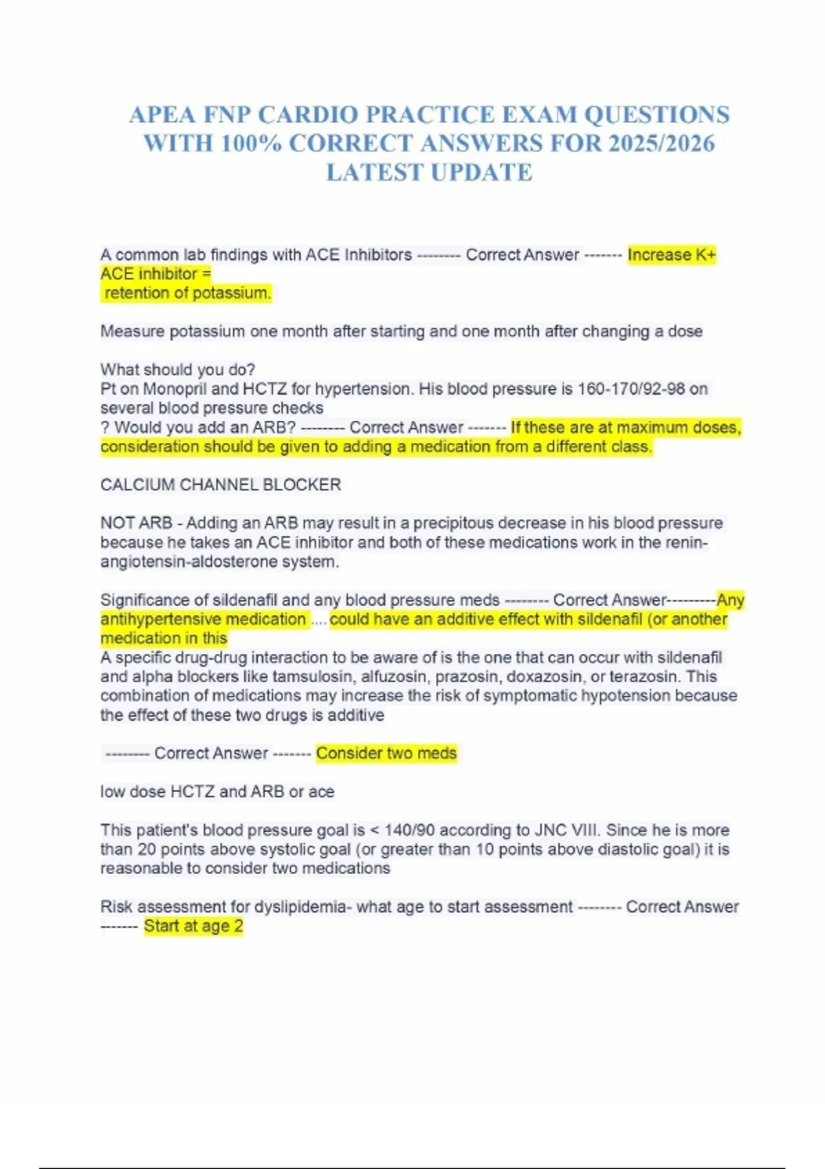 Sharpen your cardiovascular knowledge and boost your confidence with the APEA FNP Cardio Practice Exam Questions – 2025/2026 Latest Update. This focused study tool is designed for Family Nurse Practitioner (FNP) students preparing for board exams, featuring 100+ clinically relevant practice questions that mirror the rigor of real-world scenarios. Every question comes with a 100% verified correct answer, followed by detailed rationales that break down the reasoning behind each answer. The content is fully aligned with the latest AANP/ANCC exam blueprints and incorporates up-to-date guidelines from authorities like the American Heart Association. Covers high-yield topics such as hypertension management, coronary artery disease, arrhythmias, heart failure, dyslipidemia, anticoagulation, and cardiac diagnostics. Case-based formats and select-all-that-apply questions help develop clinical decision-making and critical-thinking skills.