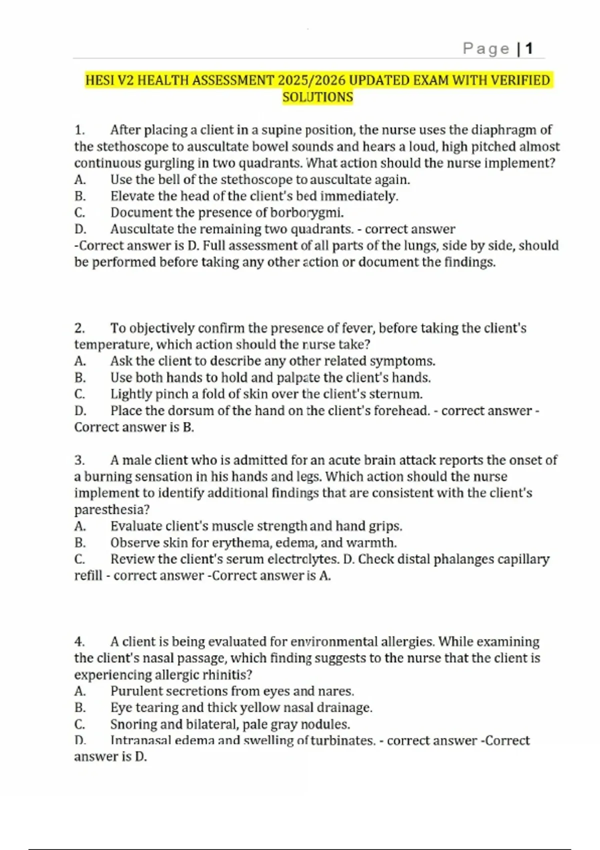 HESI V2 HEALTH ASSESSMENT 2025/2026 UPDATED EXAM WITH VERIFIED SOLUTIONS