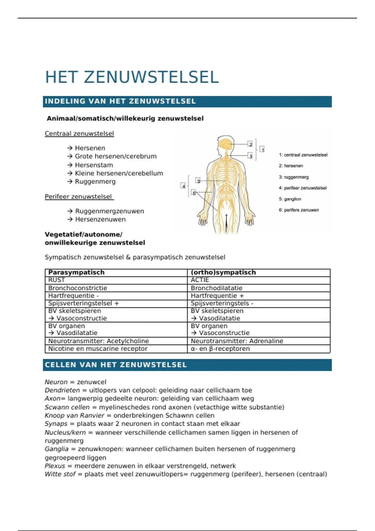 Deze uitgebreide maar heldere samenvatting bevat alle belangrijke onderdelen van het zenuwstelsel, gebaseerd op de lesinhoud. Alles staat overzichtelijk per hoofdstuk, met duidelijke kernpunten en eenvoudige uitleg. Inhoud van deze samenvatting: Indeling van het zenuwstelsel (CZS, PZS, animaal, autonoom) Sympatisch vs parasympatisch (duidelijk in tabelvorm) Bouw van neuronen: dendrieten, axon, synaps, myeline, Schwann-cellen Verschil tussen grijze en witte stof De hersenvliezen, liquor & bloed-hersenbarrière Grote hersenen, kleine hersenen, hersenstam & tussenhersenen Ruggenmerg: interne en externe bouw Alle 12 hersenzenuwen + functies Alle ruggenmergzenuwen Fysiologie: actiepotentiaal stap voor stap (rust → depolarisatie → repolarisatie → hyperpolarisatie → rust) Geleiding in myeline vs niet-myeline Prikkeloverdracht & neurotransmitters Werking van sympatisch en parasympatisch, inclusief banen en neurotransmitters BMLT