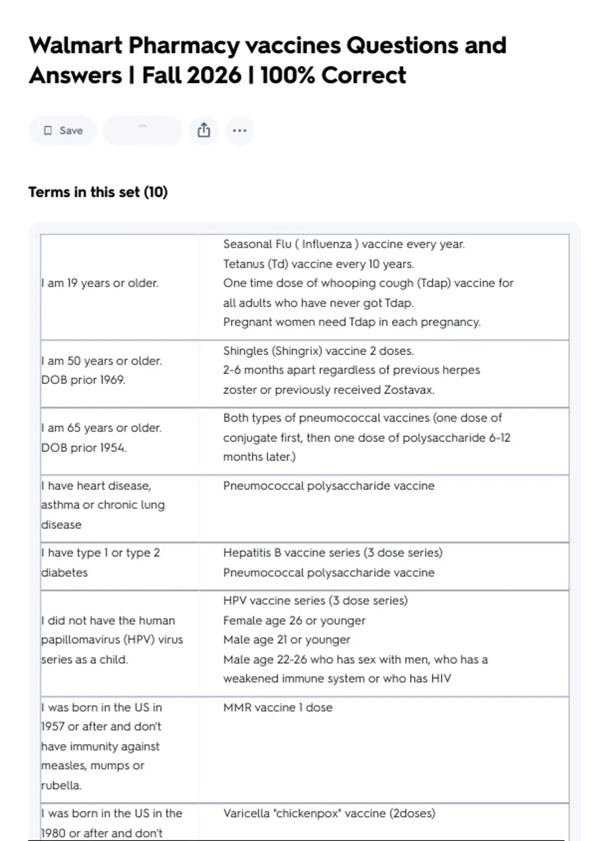 Walmart Pharmacy vaccines Questions and Answers | Fall 2026 | 100% Correct