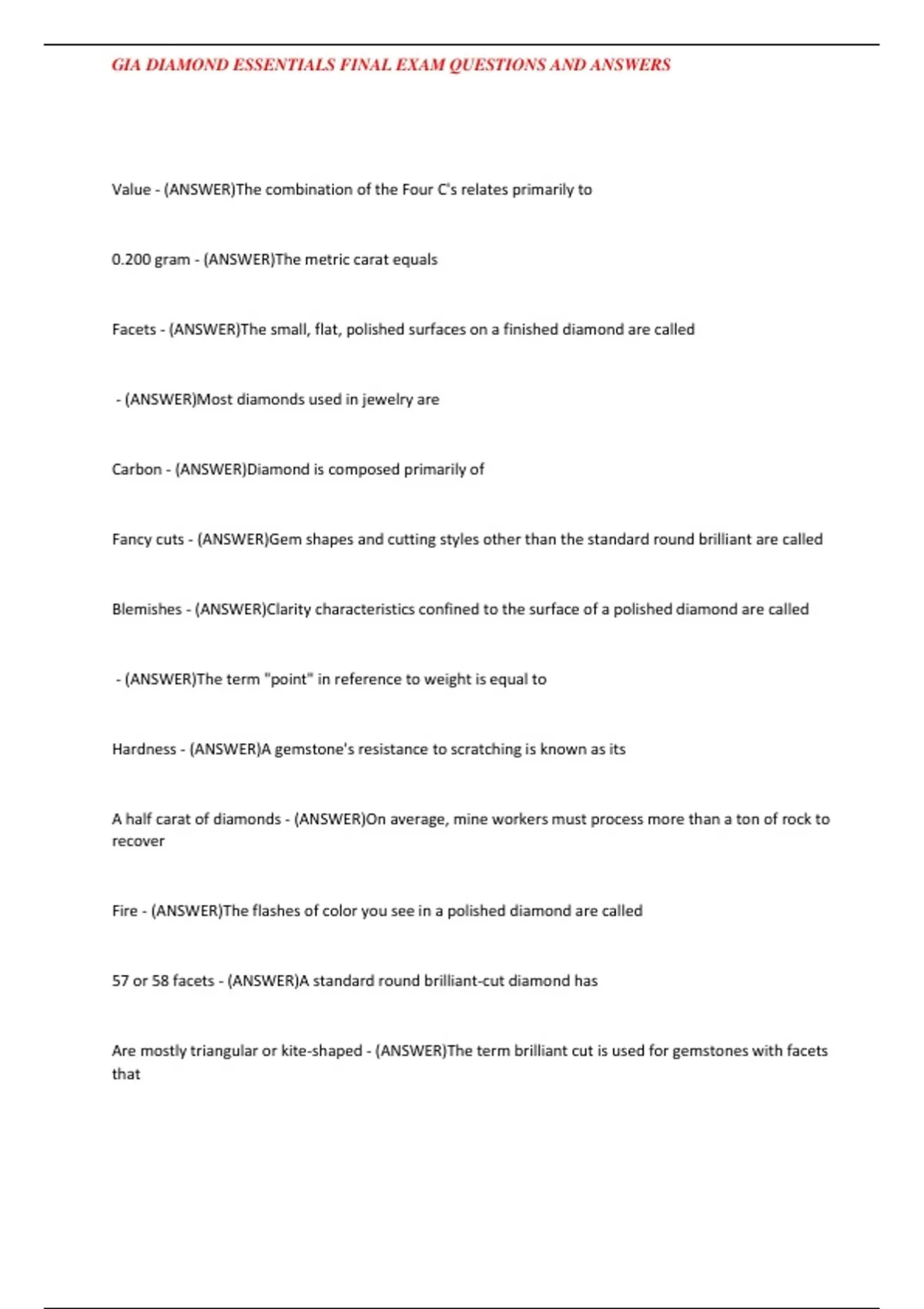 GIA DIAMOND ESSENTIALS FINAL EXAM QUESTIONS AND ANSWERS