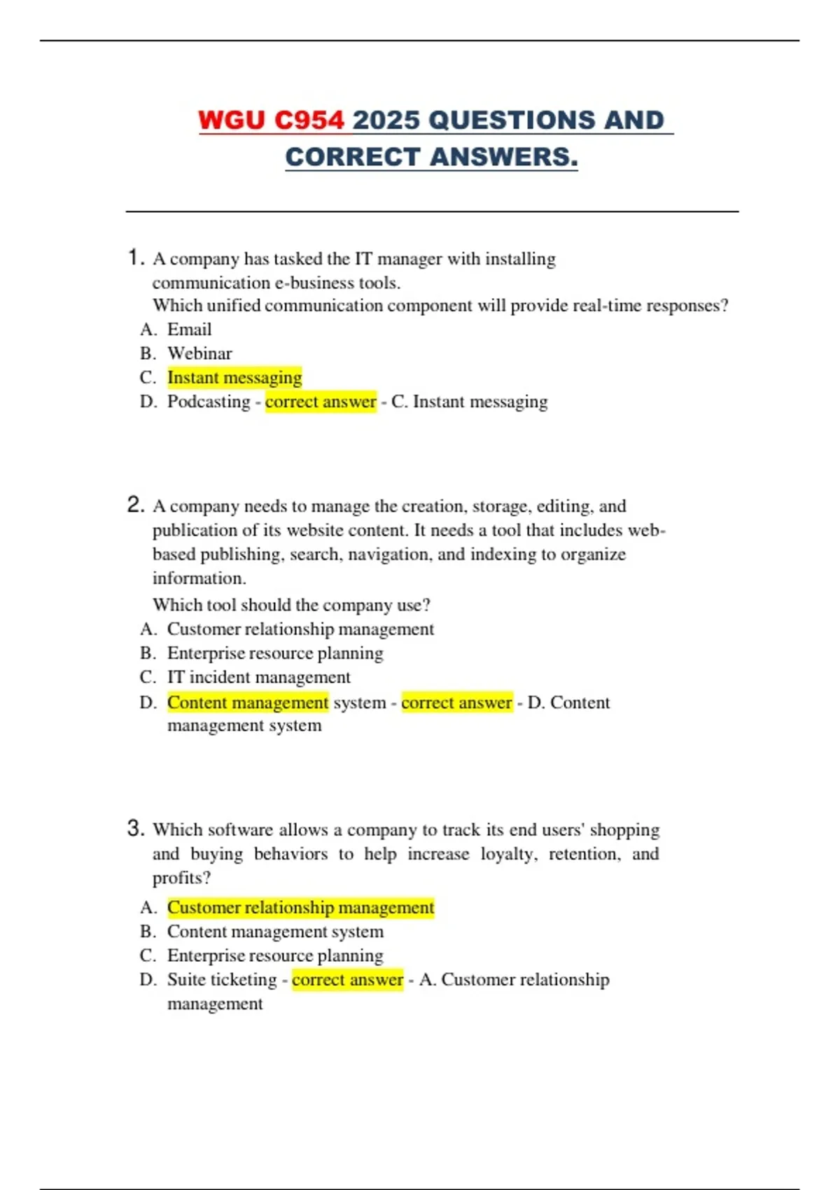 This document contains the full collection of WGU C954 exam questions paired with their correct answers for the 2025 assessment cycle. It covers the complete range of tested topics, including MIS concepts, project management, cybersecurity, data management, IT infrastructure, cloud computing, and enterprise systems. The material is structured as a comprehensive question-and-answer set, making it suitable for exam preparation, quick review, or targeted study of specific subject areas.