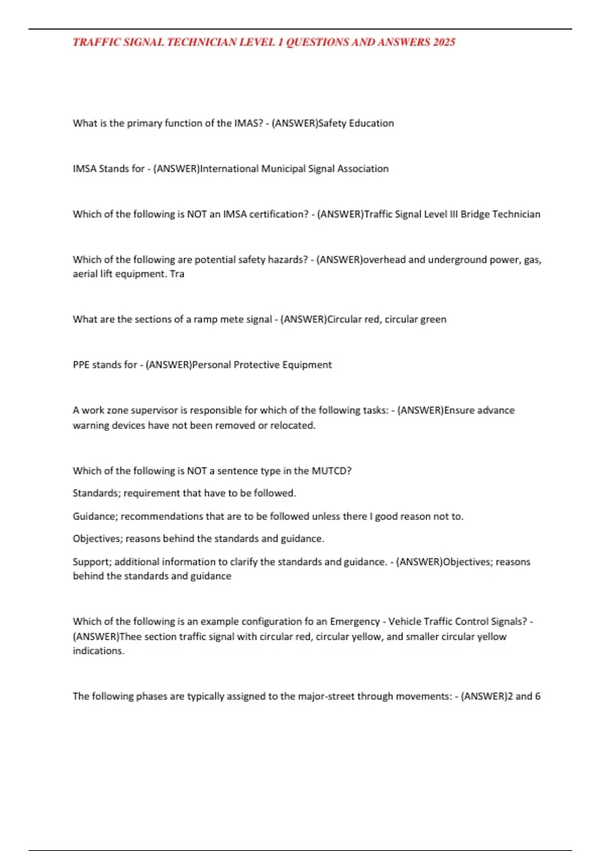 , TRAFFIC SIGNAL TECHNICIAN LEVEL 1 QUESTIONS AND ANSWERS 2025
