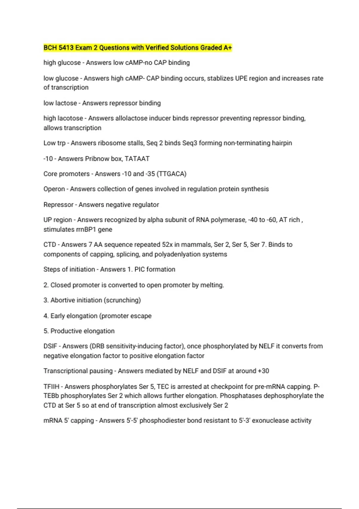 BCH 5413 Exam 2 Questions with Verified Solutions Graded A+ high glucose - Answers low cAMP-no CAP binding low glucose - Answers high cAMP- CAP binding occurs, stablizes UPE region and increases rate of transcription low lactose - Answers repressor binding high lacotose - Answers allolactose inducer binds repressor preventing repressor binding, allows transcription Low trp - Answers ribosome stalls, Seq 2 binds Seq3 forming non-terminating hairpin -10 - Answers Pribnow box, TATAAT Core promoters - Answers -10 and -35 (TTGACA) Operon - Answers collection of genes involved in regulation protein synthesis Repressor - Answers negative regulator UP region - Answers recognized by alpha subunit of RNA polymerase, -40 to -60, AT rich , stimulates rrnBP1 gene CTD - Answers 7 AA sequence repeated 52x in mammals, Ser 2, Ser 5, Ser 7. Binds to components of capping, splicing, and polyadenlyation systems Steps of initiation - Answers 1. PIC formation 2. Closed promoter is converted to open promoter by melting. 3. Abortive initiation (scrunching) 4. Early elongation (promoter escape 5. Productive elongation DSIF - Answers (DRB sensitivity-inducing factor), once phosphorylated by NELF it converts from negative elongation factor to positive elongation factor Transcriptional pausing - Answers mediated by NELF and DSIF at around +30 TFIIH - Answers phosphorylates Ser 5, TEC is arrested at checkpoint for pre-mRNA capping. P-TEBb phosphorylates Ser 2 which allows further elongation. Phosphatases dephosphorylate the CTD at Ser 5 so at end of transcription almost exclusively Ser 2 mRNA 5' capping - Answers 5'-5' phosphodiester bond resistant to 5'-3' exonuclease activity mRNA 5' cap roles - Answers 1. required for splicing 2. CBP binds to cap to facilitate tranport of MRNA into cytoplasm 3. CBP binds to facilitates translation of mRNA 4. Stimulates polyadenylation 5. decapping is involved in regulation of mRNA turnover Polyadenylation (poly a tail) - Answers NOT synonymous with transcription termination Hofer and Darnell experiment showed that transcription terminates downstream of Poly-A site. Torpedo Model - Answers Cleavage of poly A site to make tail creates an unprotected 5' end which is degraded by exonuclease and digests RNA until it reaches polymerase which destabilizes complex and transcription stops Poly A Signal - Answers AAUAAA, and G/U CSPF - Answers Cleavage and polyadenylation specificity factor CSPF 160 - Answers binds AAUAAA site CstF64 (cleavage stimulating factor) - Answers binds GU rich area CSPF 73 - Answers endonuclease Polymerase of Poly A - Answers templated-INdependent RNA synthesis, slow polyadenylation (1-2 A sec) converted to rapid polyadenylation (25 A sec) with hydrolysis of ATP Typical poly A-tail - Answers 100-200 bases Multiple polyadenylation sites - Answers possible, helps regulate gene expression altering stability and turnover CHIP analysis - Answers 1. Formaldehyde cross-linking, 2. lyse cells, shear chromatin 3. immunoprecipitate with appropriate antibody 4. reverse cross-links 5. PCR analysis Phosphorylation of pol II CTD on Ser 2 and Ser 5 _____ - Answers recruits the capping apparatus to mRNA Ser 2 remains attached to - Answers ABD1 Splicing mechanism - Answers 1. First transesterification: 2 OH of branch site adenine attacks the phosphodiester bond at the 5' splice sit forming lariat of introns 2. Second transesterificaton: 3-OH on 5' exon attacks the phosphodiester at the 3' splice site Splice site consensus sequenes - Answers 5' end of intron is GU 3' end of intron is AG Branch point - Answers A (20-50 bp upstream 3' splice site) Spliceosome - Answers nuclear complexes responsible for removing intron-derived sequences from hnRNA *contains 8 common snRNP U1 - Answers snRNP binds to 5' splice site U2 - Answers snRNP binds the branch site