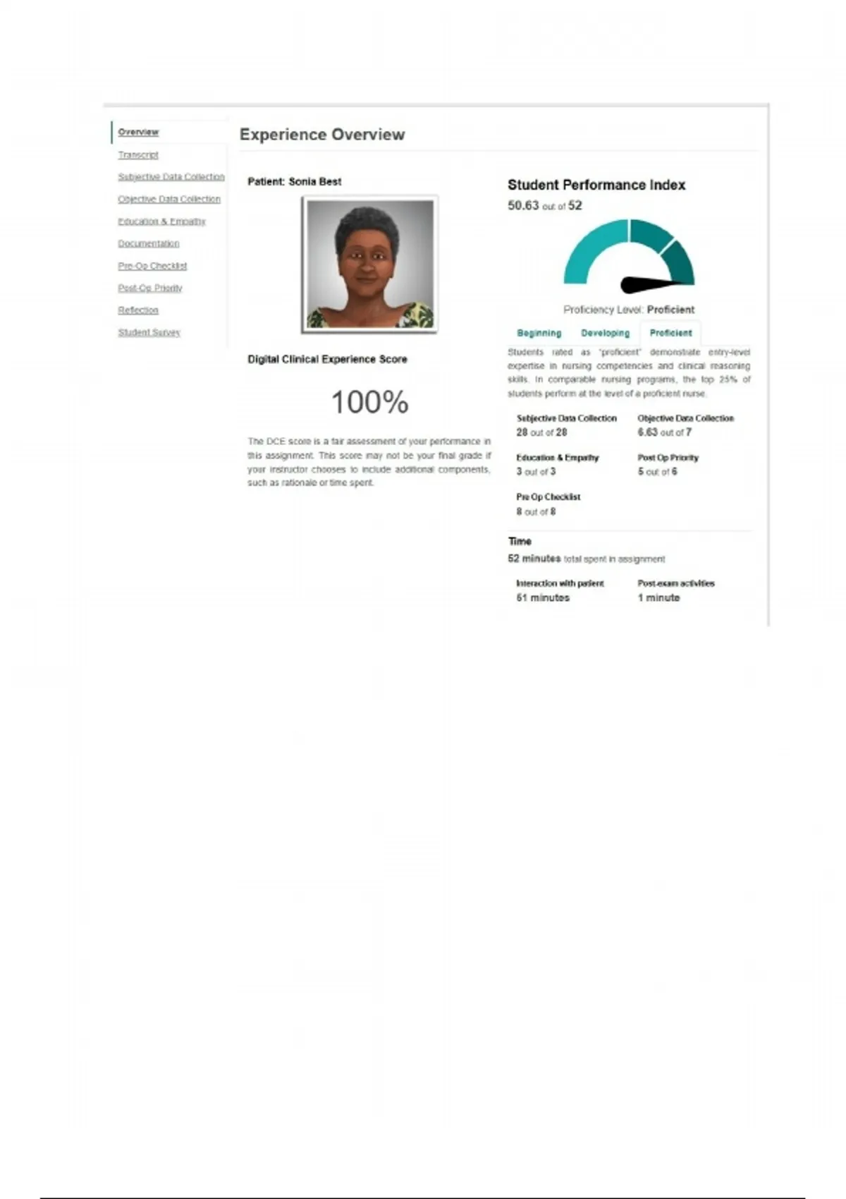 ‘Subjective Data Collection Patient: Sonia Best Student Performance Index