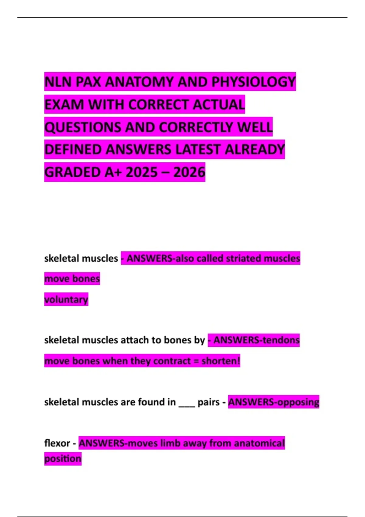 NLN PAX ANATOMY AND PHYSIOLOGY EXAM WITH CORRECT ACTUAL QUESTIONS AND CORRECTLY WELL DEFINED ANSWERS LATEST ALREADY GRADED A+ 2025 – 2026