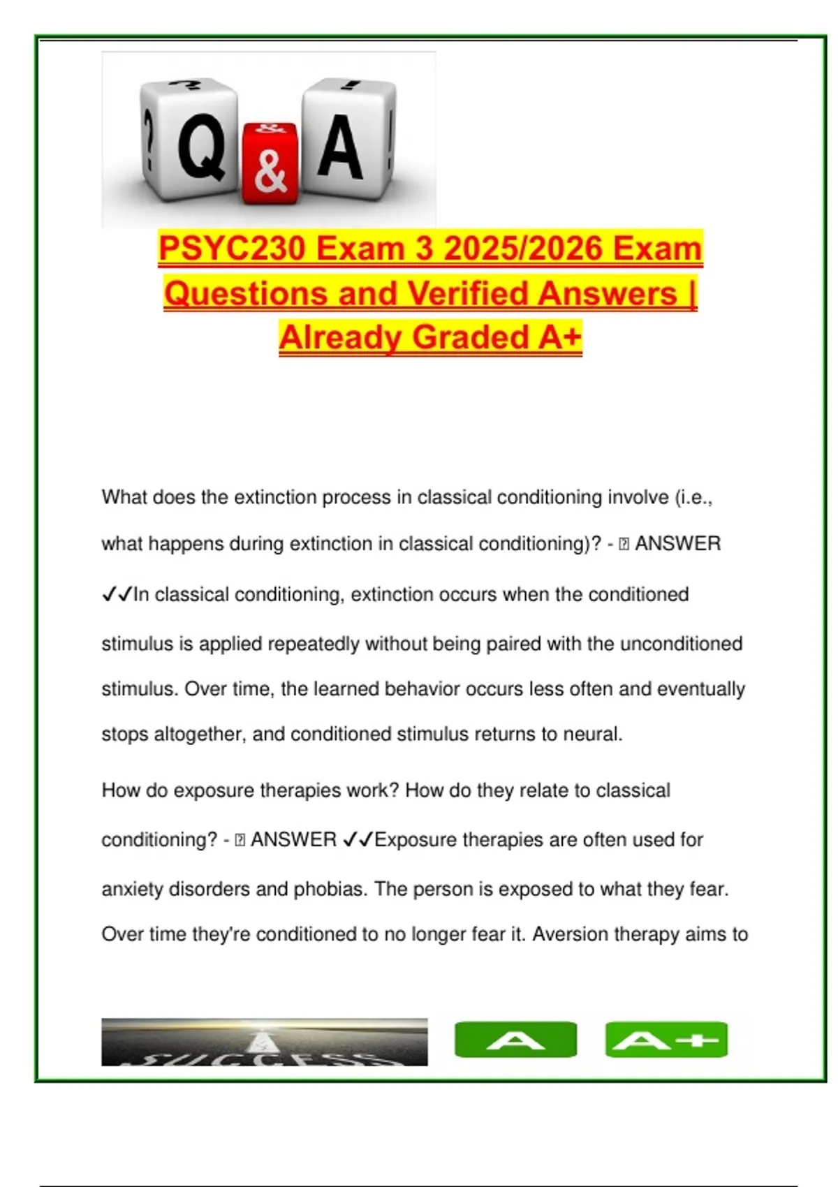 This in-depth study guide includes over 150 carefully crafted questions and fully explained answers for PSYC 230: Cognitive Psychology at the University of Illinois Urbana-Champaign (UIUC), focused on Exam 3 for the 2025/2026 academic year. The document offers a thorough exploration of learning theories, including both classical and operant conditioning, and applies these frameworks to real-world behavioral and therapeutic contexts. Key coverage includes: Classical Conditioning: extinction, counterconditioning, systematic desensitization, aversive therapy, exposure therapy, fear hierarchies, and avoidance behavior Operant Conditioning: reinforcement types (positive, negative, primary, secondary, generalized), shaping, chaining, and reinforcement schedules (fixed ratio, variable interval, etc.) Associative Learning Theories: Thorndike’s Law of Effect, Skinner’s behaviorism, Guthrie & Horton’s stop-action principle, Mowrer’s two-factor theory Conditioning Applications: establishing sleep routines, treating anxiety, ERP therapy, and behavioral modification Special Topics: learned helplessness (Seligman), ghosting as avoidance (LeFebvre et al.), response chains, maladaptive coping, contingency and timing in reinforcement It provides clear distinctions between procedures like discrete vs. free-operant trials, defines three-term contingencies, and integrates modern research and case-based applications that help illustrate psychological principles in everyday life. The layout is student-friendly and ideal for memorization, concept mastery, and test practice. Ideal for: Psychology majors at UIUC studying learning, behavior, and therapeutic intervention Students in cognitive-behavioral, neuroscience, or clinical psychology tracks Anyone preparing for advanced tests involving conditioning theory, behavior modification, and applied learning strategies Keywords: classical conditioning, operant conditioning, extinction, counterconditioning, reinforcement schedules, shaping, chaining, exposure therapy, ERP therapy, learned helplessness, behaviorism, reinforcement types, escape avoidance, ghosting study, aversive therapy, systematic desensitization, response chains, conditioning theory, PSYC 230, UIUC
