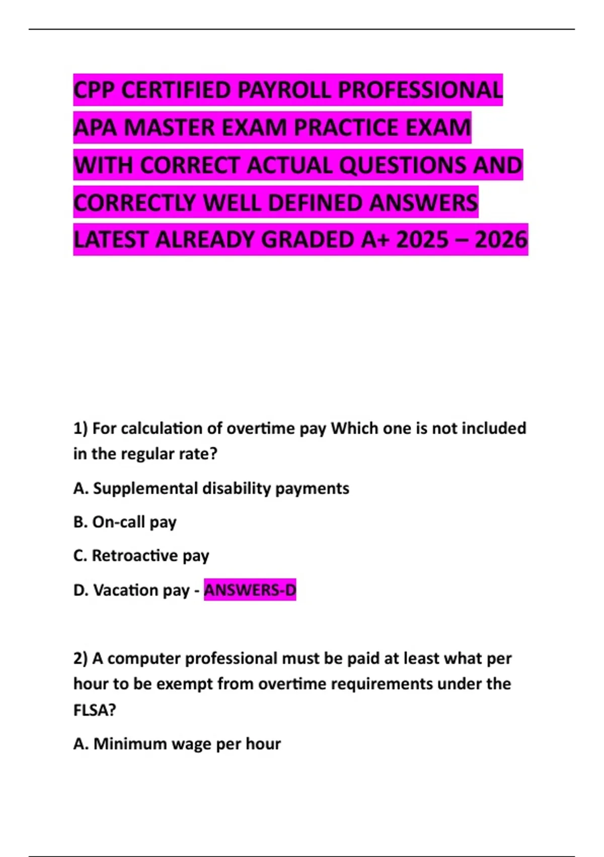 CPP CERTIFIED PAYROLL PROFESSIONAL APA MASTER EXAM PRACTICE EXAM WITH CORRECT ACTUAL QUESTIONS AND CORRECTLY WELL DEFINED ANSWERS LATEST ALREADY GRADED A+ 2025 – 2026