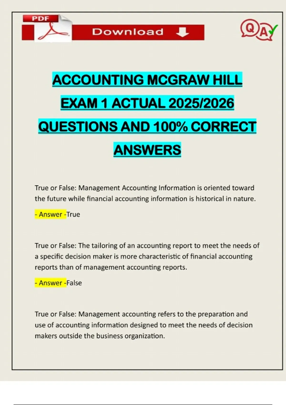 ACCOUNTING MCGRAW HILL EXAM 1 ACTUAL 2025/2026 QUESTIONS AND 100% CORRECT ANSWERS True or False: Management Accounting Information is oriented toward the future while financial accounting information is historical in nature. - Answer -True True or False: The tailoring of an accounting report to meet the needs of a specific decision maker is more characteristic of financial accounting reports than of management accounting reports. - Answer -False True or False: Management accounting refers to the preparation and use of accounting information designed to meet the needs of decision makers outside the business organization.Need assistance on Online classes, Exams & Assignments? Reach out for instant help!! Full Course Assistance, Plagiarism-free Essay Writing, Research Paper, Dissertation, Discussion Posts, etc…. Confidential & Secure services. Tutors are available for all subjects! Email now at: - Answer -False True or False: The content of management accounting reports needs to be presented in conformity with generally accepted accounting principles. - Answer -False