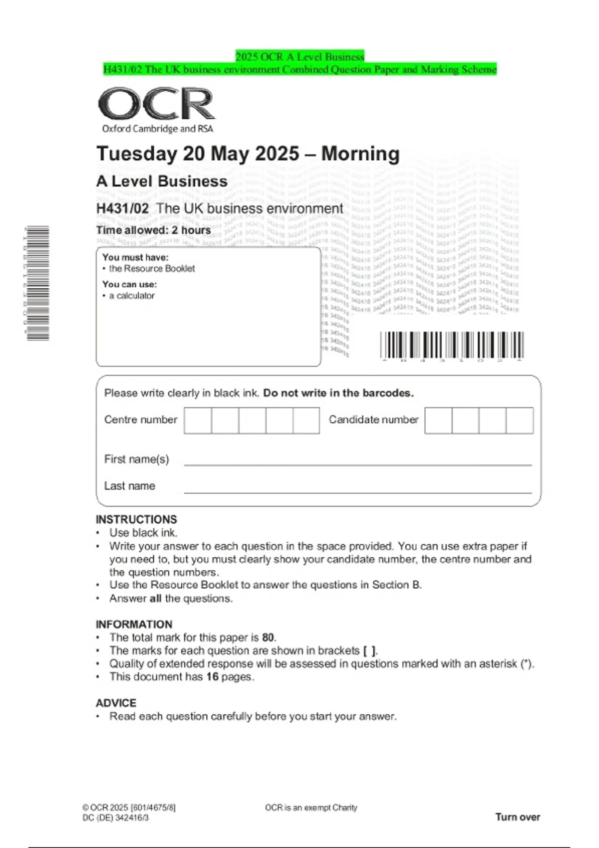 2025 OCR A Level Business H431/02 The UK business environment Combined Question Paper and Marking Scheme