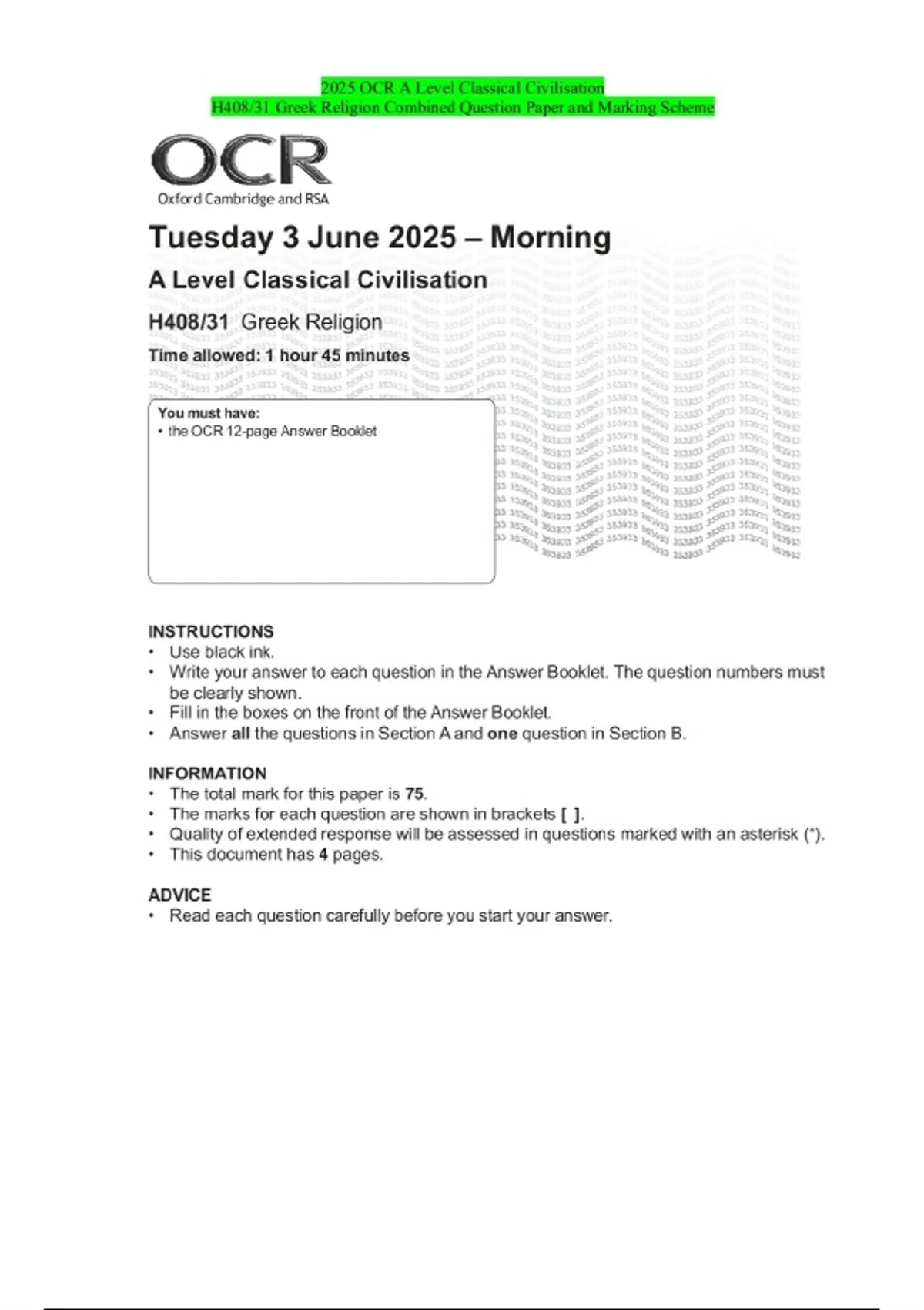 2025 OCR A Level Classical Civilisation H408/31 Greek Religion Combined Question Paper and Marking Scheme