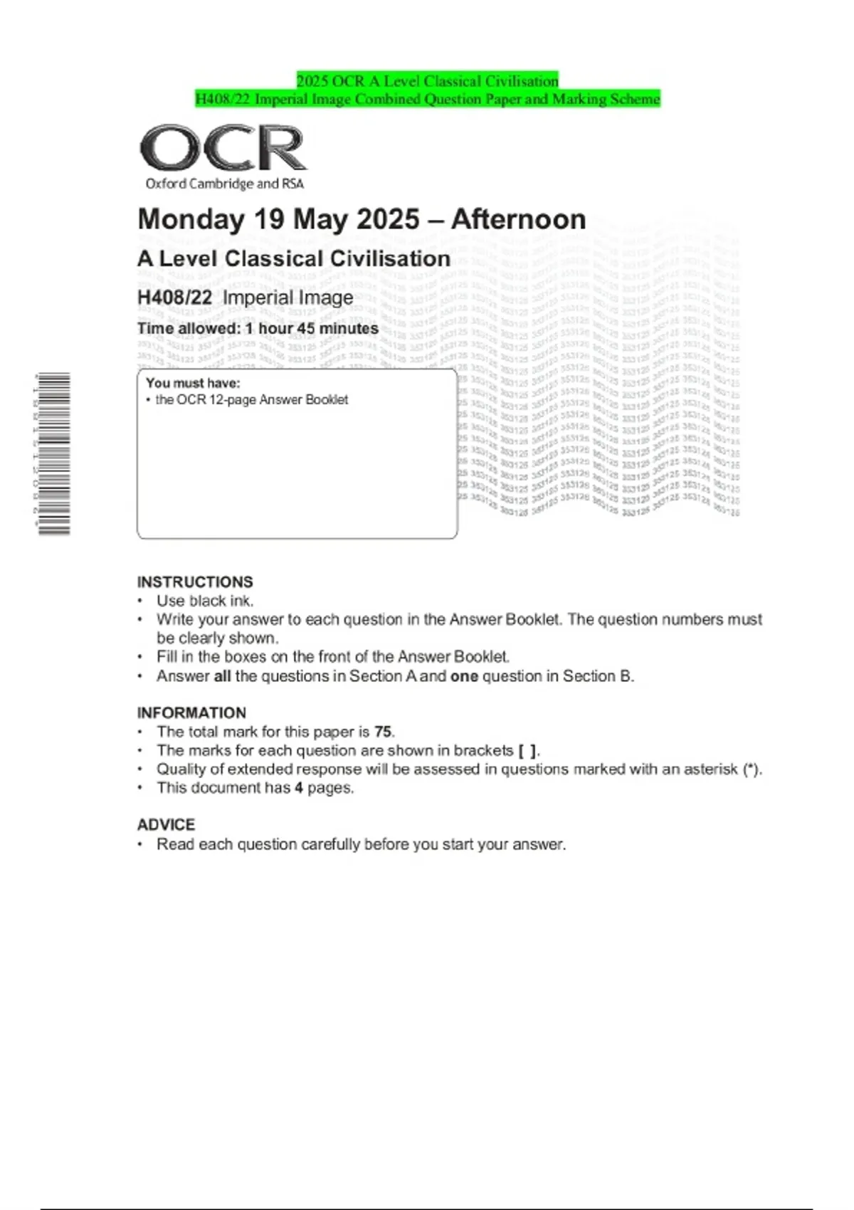 2025 OCR A Level Classical Civilisation H408/22 Imperial Image Combined Question Paper and Marking Scheme