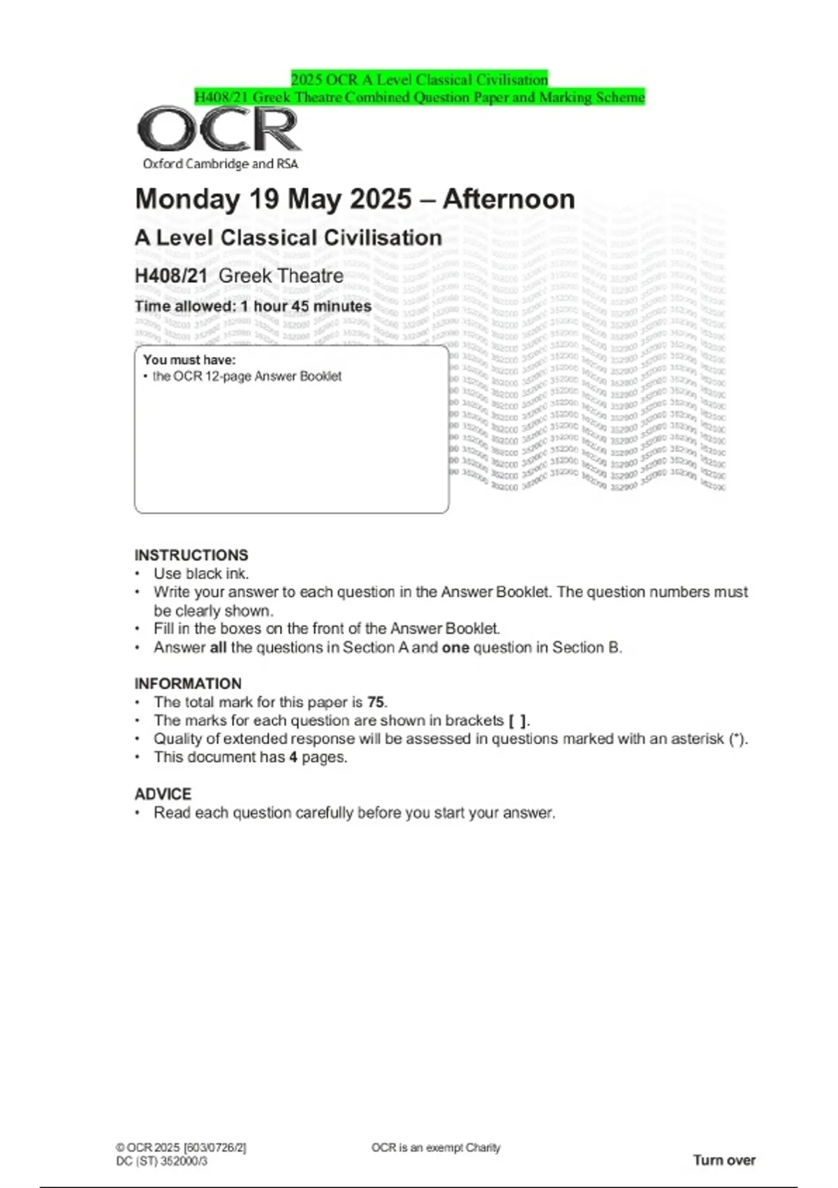 2025 OCR A Level Classical Civilisation H408/21 Greek Theatre Combined Question Paper and Marking Scheme