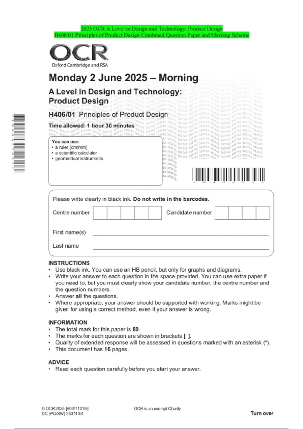 2025 OCR A Level in Design and Technology: Product Design H406/01 Principles of Product Design Combined Question Paper and Marking Scheme