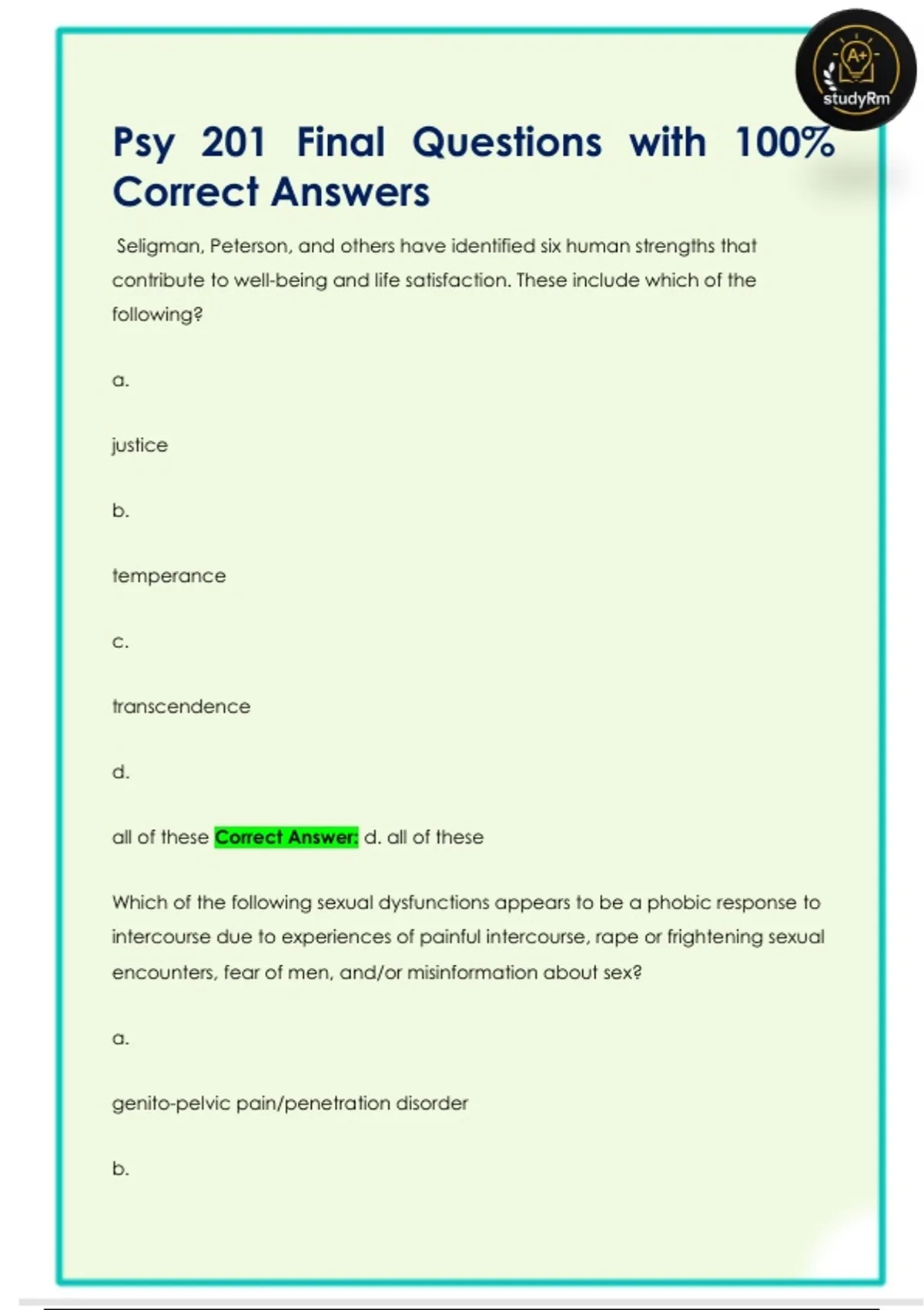 Psy 201 Final Questions with 100%