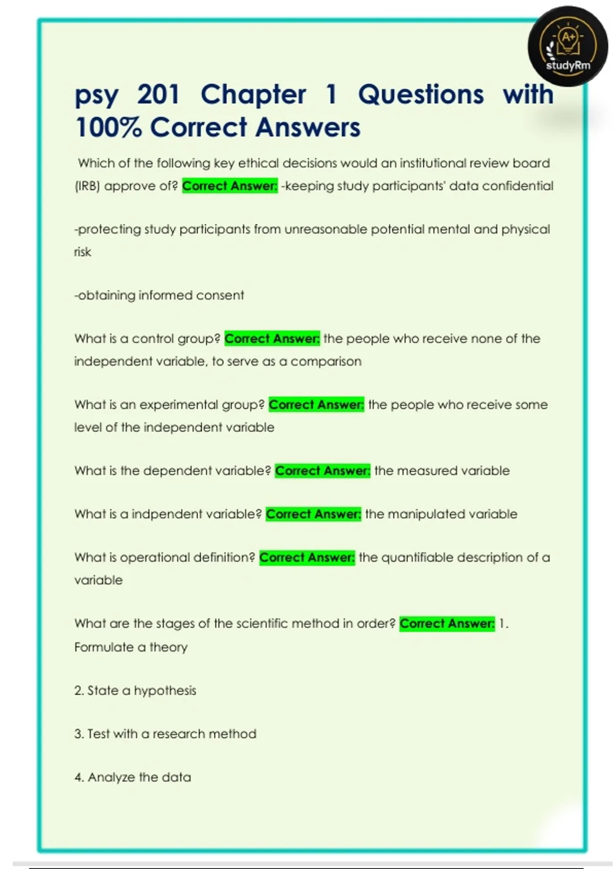 psy 201 Chapter 1 Questions with 100% Correct Answers