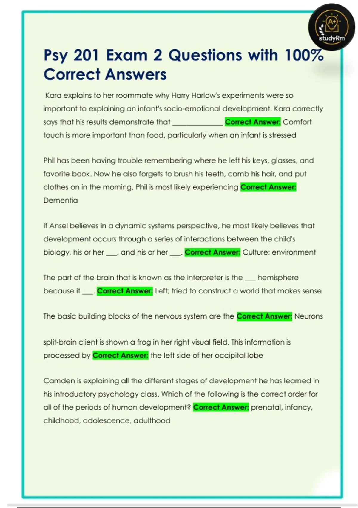 Psy 201 Exam 2 Questions with 100%