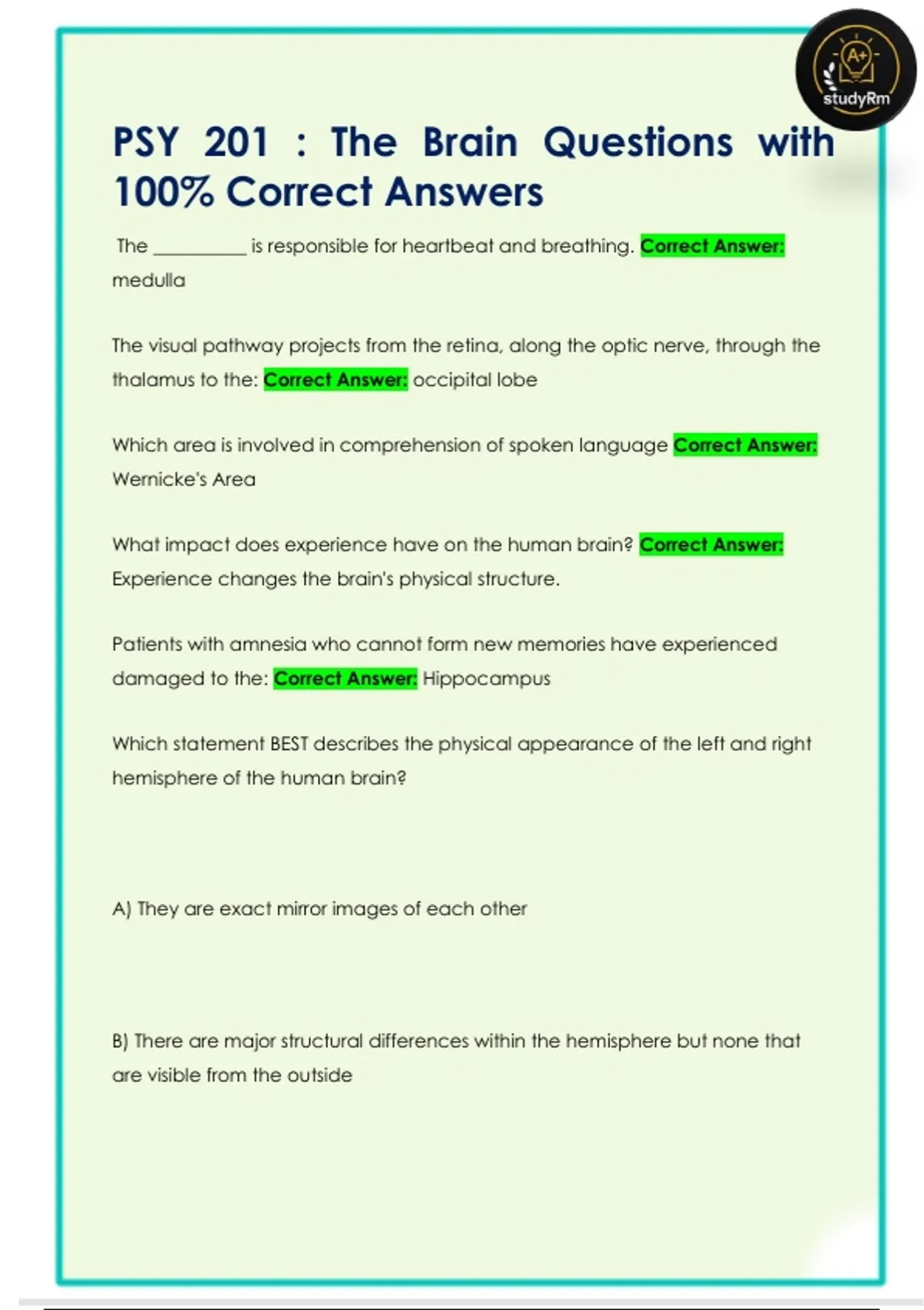 PSY 201 : The Brain Questions with