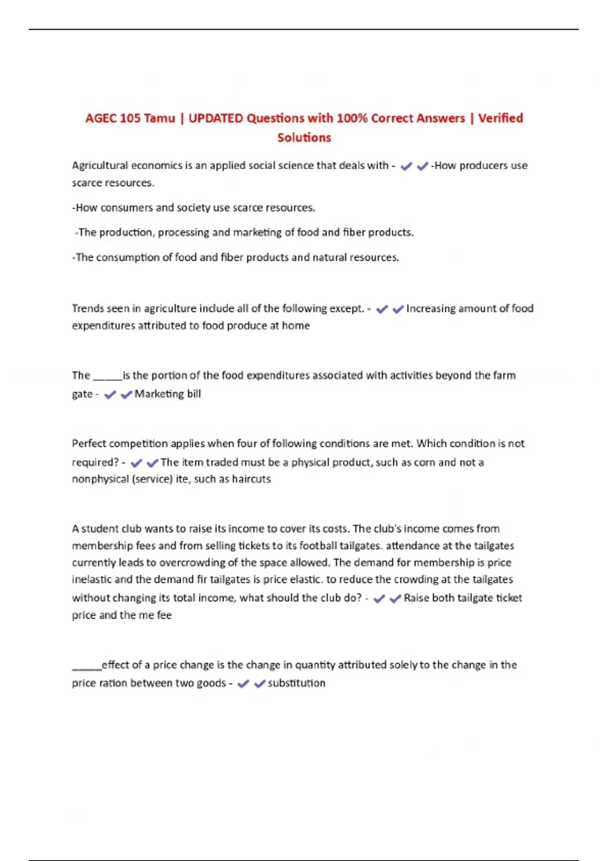 AGEC 105 Tamu | UPDATED Questions with 100% Correct Answers | Verified Solutions
