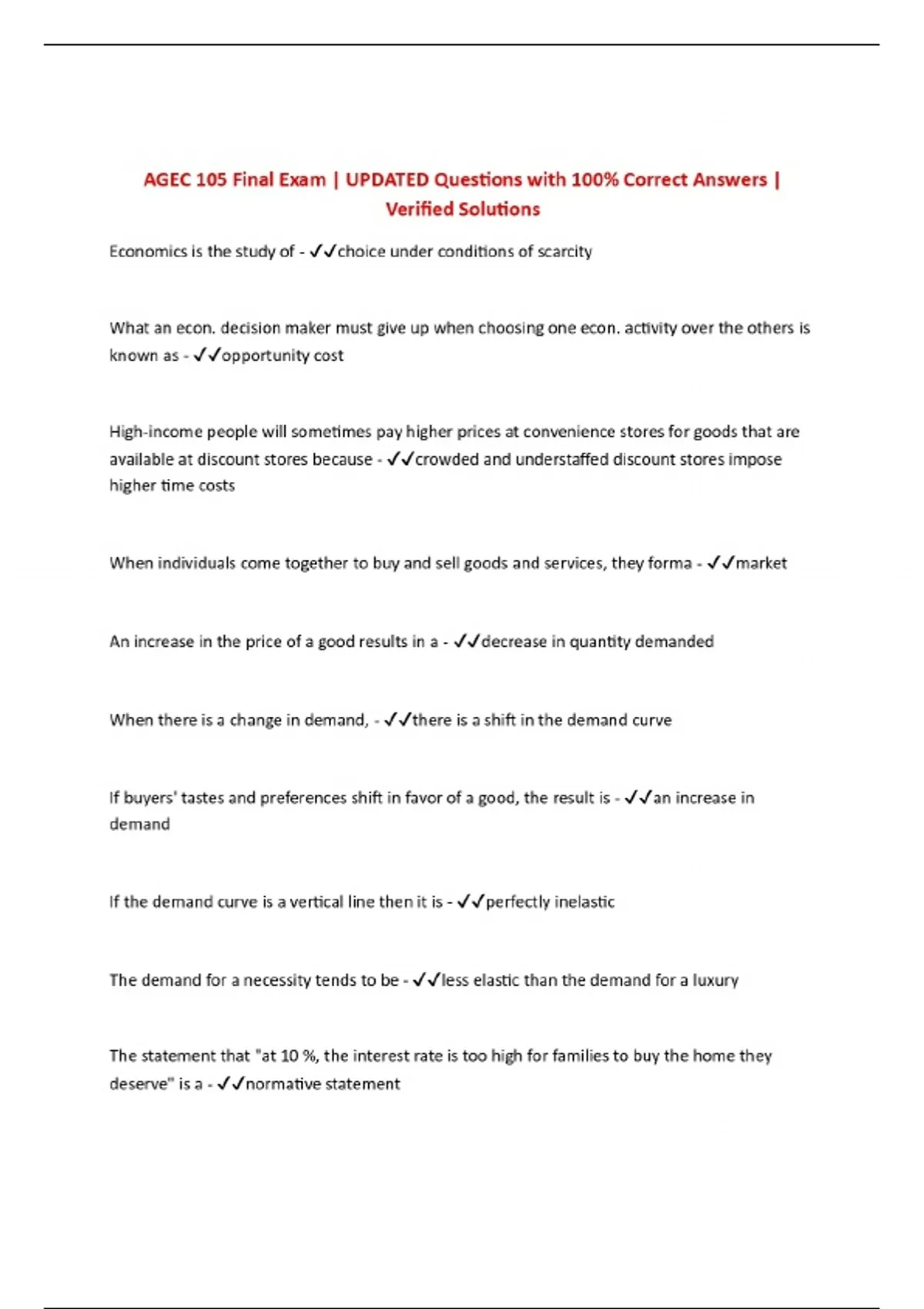 AGEC 105 Final Exam | UPDATED Questions with 100% Correct Answers | Verified Solutions