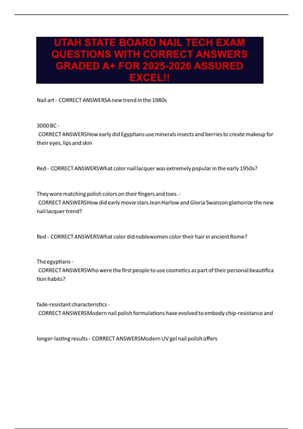 UTAH STATE BOARD NAIL TECH EXAM QUESTIONS WITH CORRECT ANSWERS GRADED A.pdf