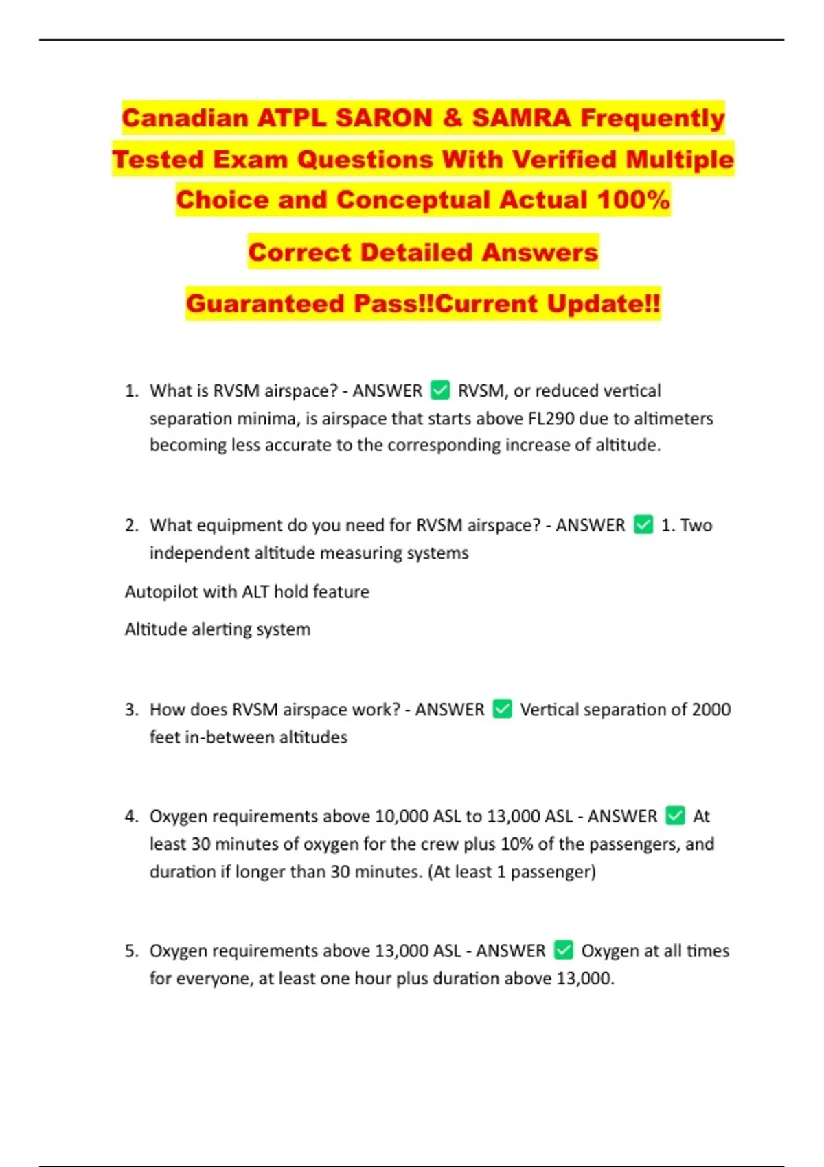Canadian ATPL SARON & SAMRA Frequently Tested Exam Questions With Verified Multiple Choice and Conceptual Actual 100% Correct Detailed Answers Guaranteed Pass!!Current Update!! 1. What is RVSM airspace? - ANSWER RVSM, or reduced vertical separation minima, is airspace that starts above FL290 due to altimeters becoming less accurate to the corresponding increase of altitude. 2. What equipment do you need for RVSM airspace? - ANSWER - Two independent altitude measuring systems - Autopilot with ALT hold feature - Altitude alerting system 3. How does RVSM airspace work? - ANSWER Vertical separation of 2000 feet in-between altitudes 4. Oxygen requirements above 10,000 ASL to 13,000 ASL - ANSWER At least 30 minutes of oxygen for the crew plus 10% of the passengers, and duration if longer than 30 minutes. (At least 1 passenger) 5. Oxygen requirements above 13,000 ASL - ANSWER Oxygen at all times for everyone, at least one hour plus duration above 13,000. 6. Oxygen requirements above FL250 - ANSWER mask if quick donning masks are NOT available 7. Oxygen requirements above FL410 - ANSWER Pilot in control must wear Pilot at controls must have oxygen mask on at all times, even if its quick donning.