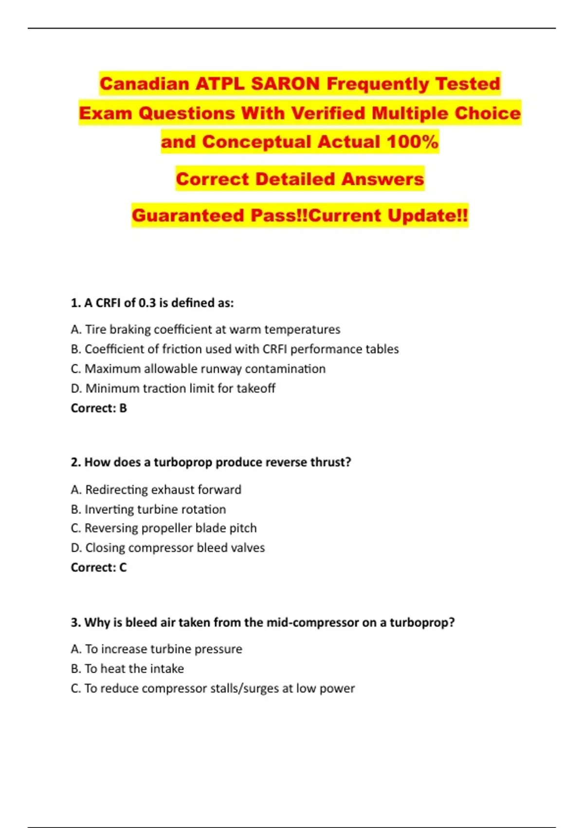Canadian ATPL SARON Frequently Tested Exam Questions With Verified Multiple Choice and Conceptual Actual 100% Correct Detailed Answers Guaranteed Pass!!Current Update!! 1. A CRFI of 0.3 is defined as: A. Tire braking coefficient at warm temperatures B. Coefficient of friction used with CRFI performance tables C. Maximum allowable runway contamination D. Minimum traction limit for takeoff Correct: B 2. How does a turboprop produce reverse thrust? A. Redirecting exhaust forward B. Inverting turbine rotation C. Reversing propeller blade pitch D. Closing compressor bleed valves Correct: C 3. Why is bleed air taken from the mid-compressor on a turboprop? A. To increase turbine pressure B. To heat the intake C. To reduce compressor stalls/surges at low power D. To increase fuel efficiency Correct: C 4. How do turbojet engines generate reverse thrust? A. Reversing blade pitch B. Stopping the compressor C. Redirecting exhaust forward outside the engine D. Spooling down the N1 fan Correct: C 5. During Beta range operation: A. The autopilot controls prop pitch B. Prop pitch and fuel flow are controlled by power levers C. Props feather automatically D. Fuel flow is fixed Correct: B