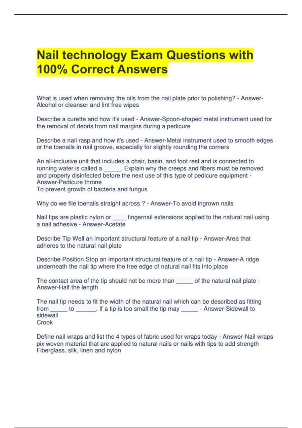 Nail technology Exam Questions with 100% Correct Answers