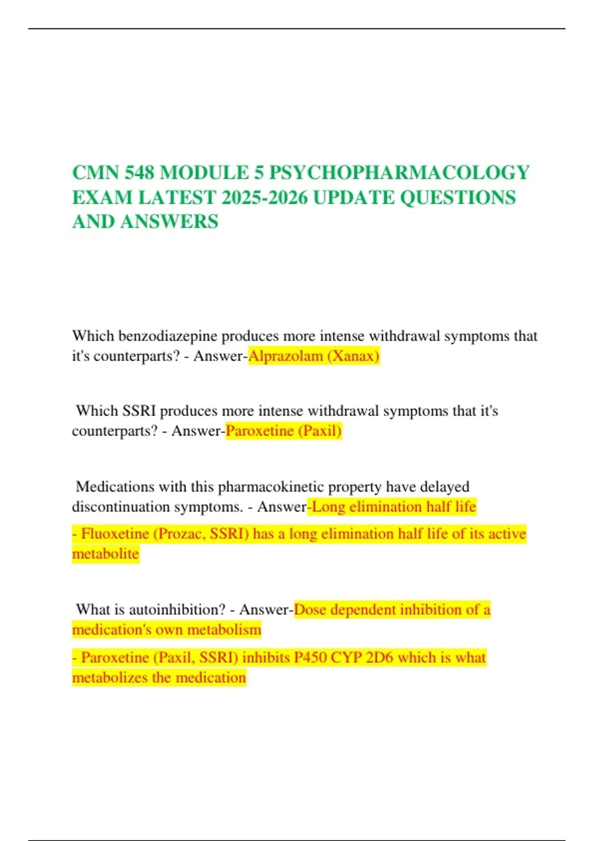 CMN 548 MODULE 5 PSYCHOPHARMACOLOGY EXAM LATEST UPDATE QUESTIONS AND ANSWERSCMN 548 MODULE 5 PSYCHOPHARMACOLOGY EXAM LATEST UPDATE QUESTIONS AND ANSWERSCMN 548 MODULE 5 PSYCHOPHARMACOLOGY EXAM LATEST UPDATE QUESTIONS AND ANSWERS