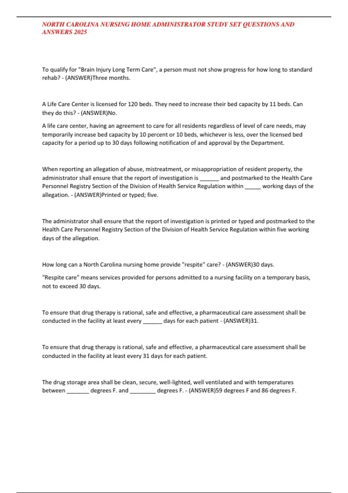 NORTH CAROLINA NURSING HOME ADMINISTRATOR STUDY SET QUESTIONS AND