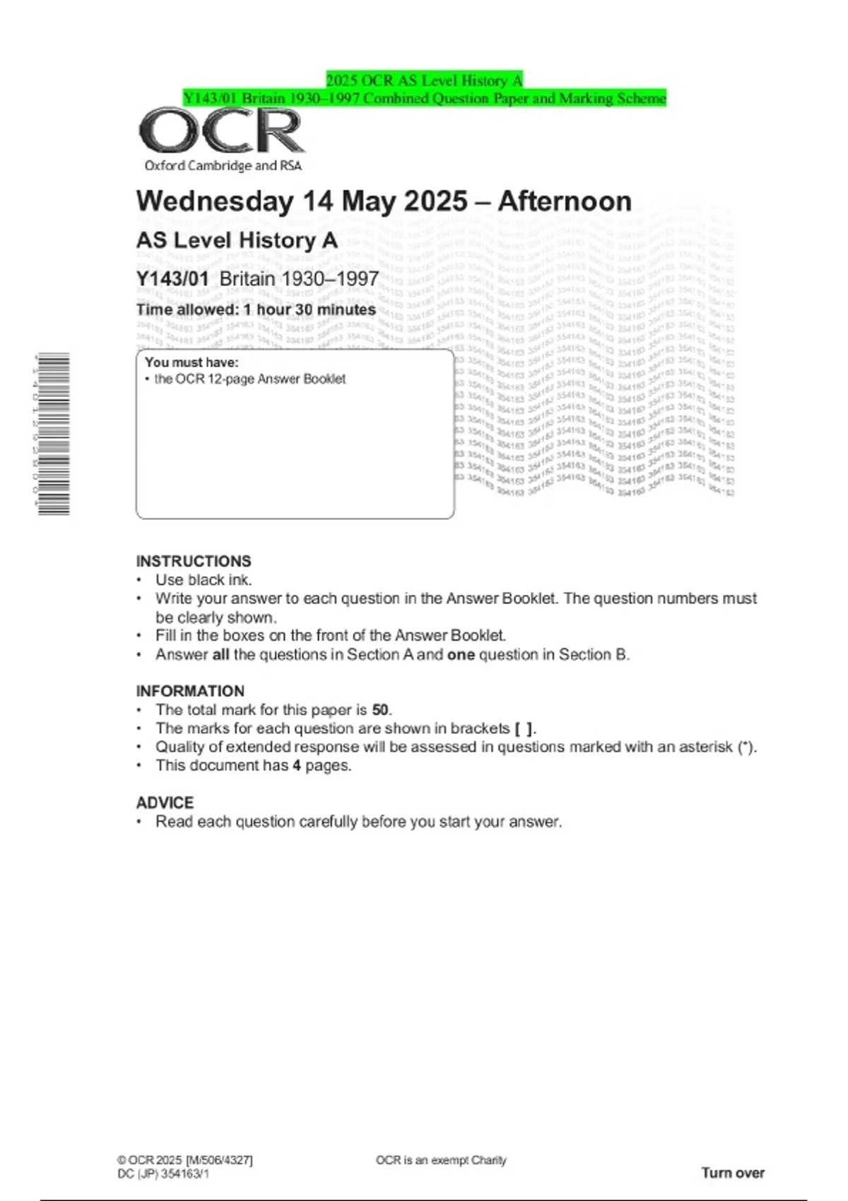 2025 OCR AS Level History A Y143/01 Britain 1930–1997 Combined Question Paper and Marking Scheme