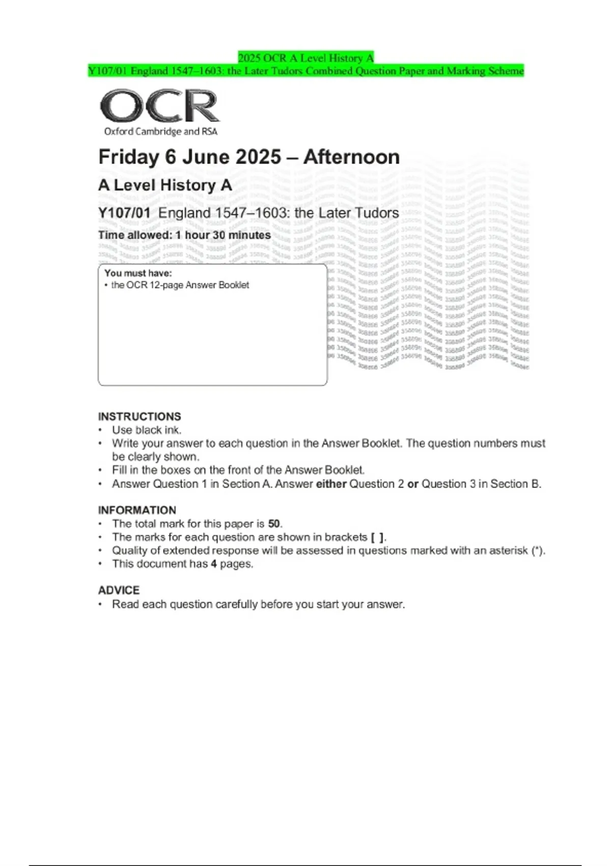 2025 OCR A Level History A Y107/01 England 1547–1603: the Later Tudors Combined Question Paper and Marking Scheme