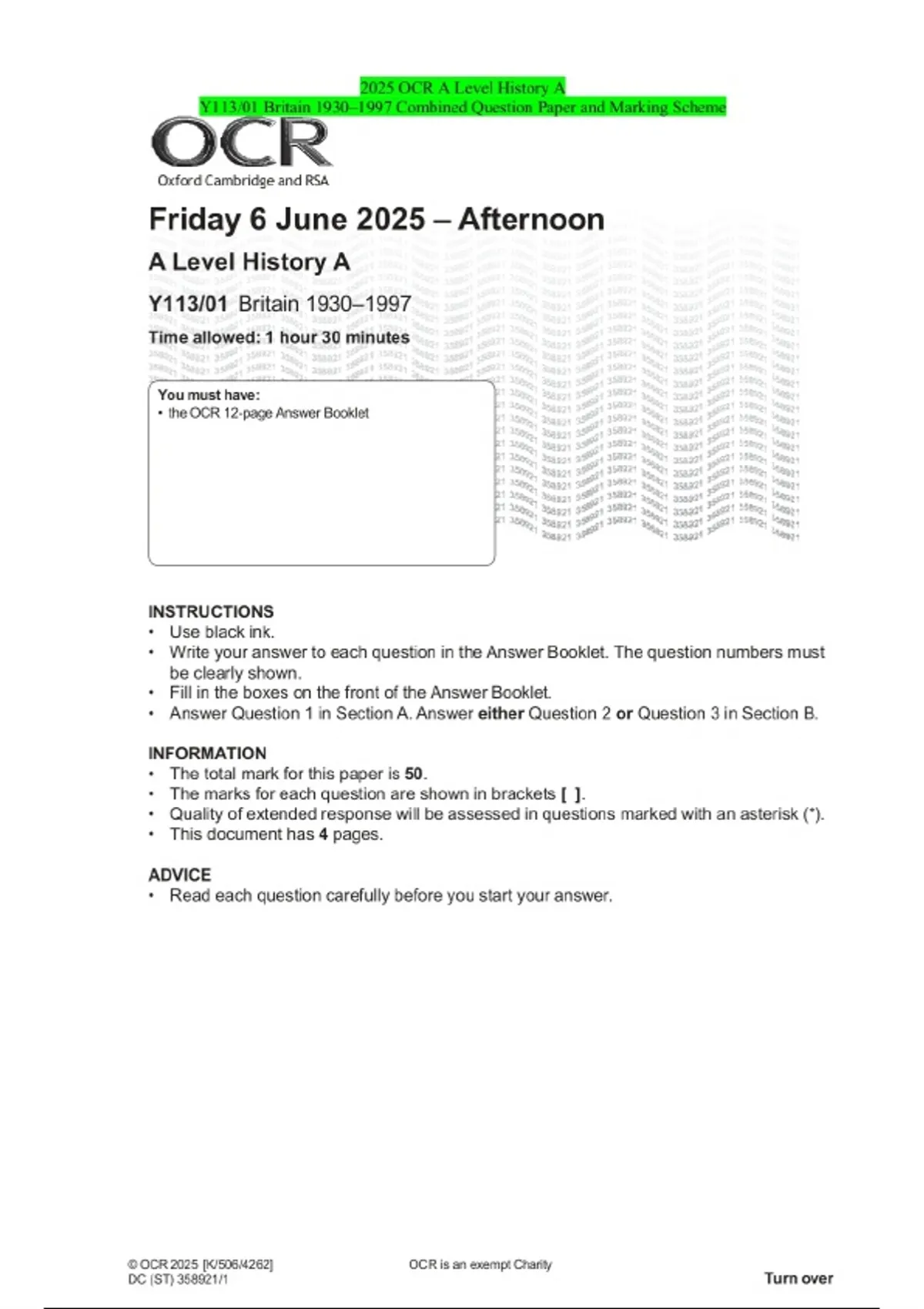 2025 OCR A Level History A Y113/01 Britain 1930–1997 Combined Question Paper and Marking Scheme
