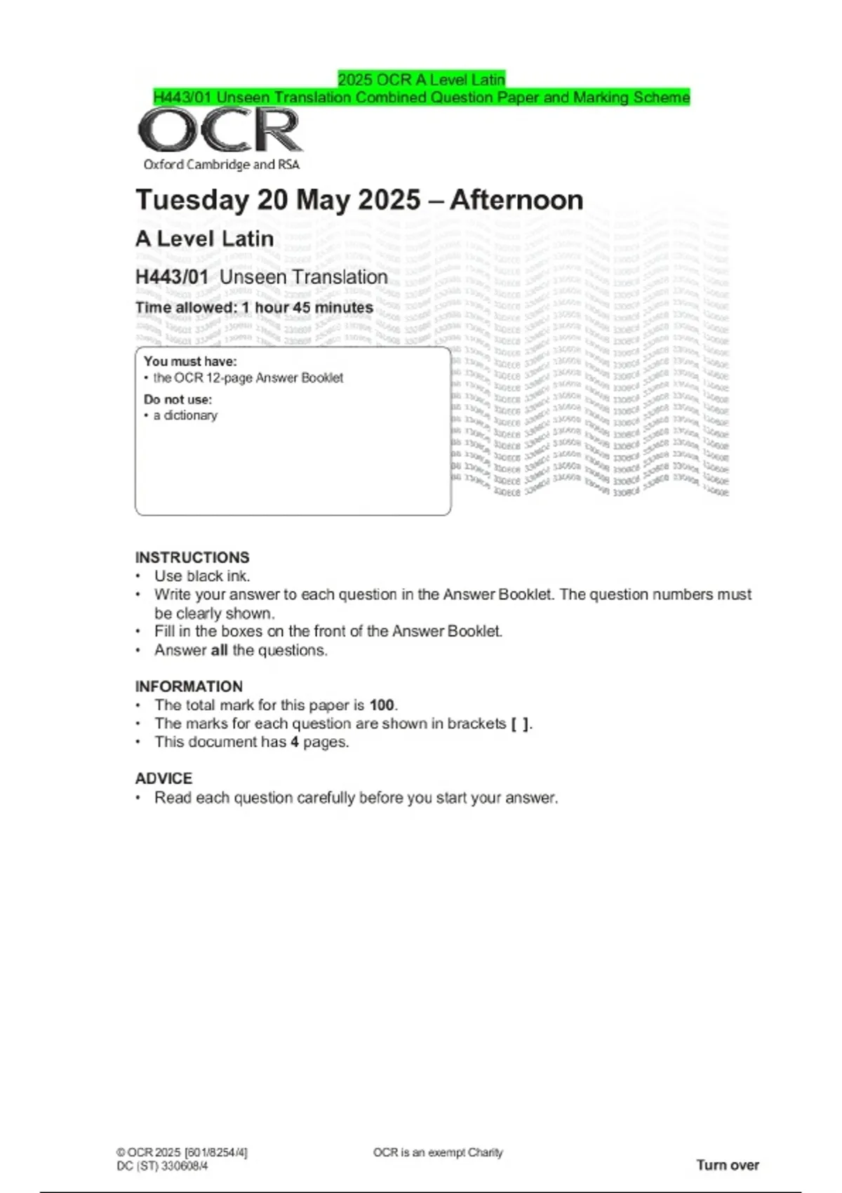 2025 OCR A Level Latin H443/01 Unseen Translation Combined Question Paper and Marking Scheme