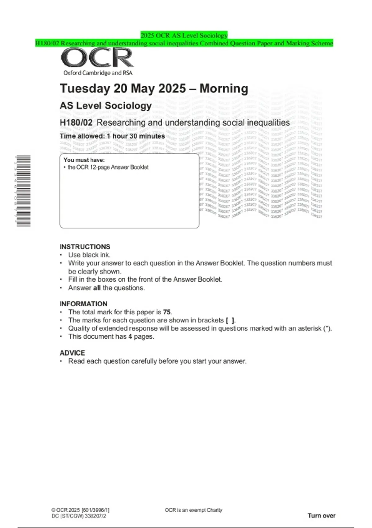 2025 OCR AS Level Sociology H180/02 Researching and understanding social inequalities Combined Question Paper and Marking Scheme