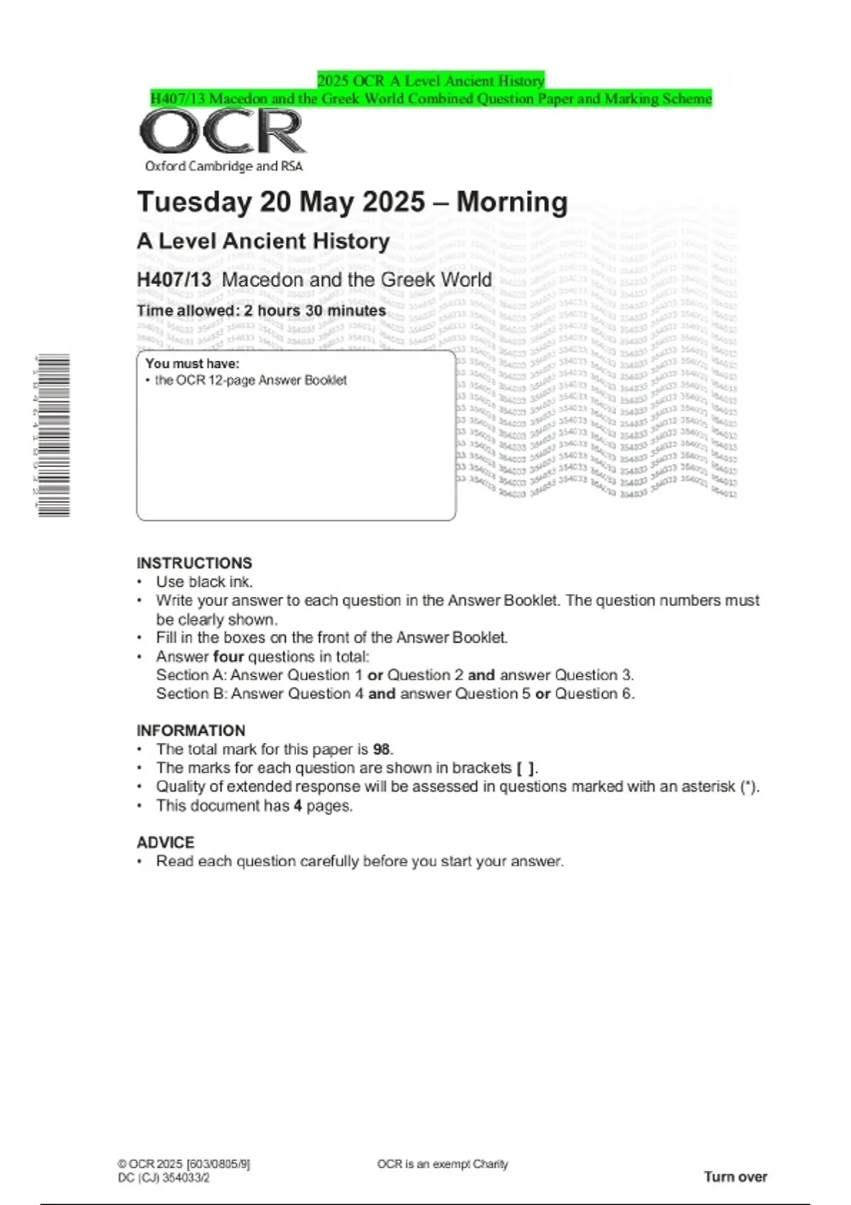 2025 OCR A Level Ancient History H407/13 Macedon and the Greek World Combined Question Paper and Marking Scheme