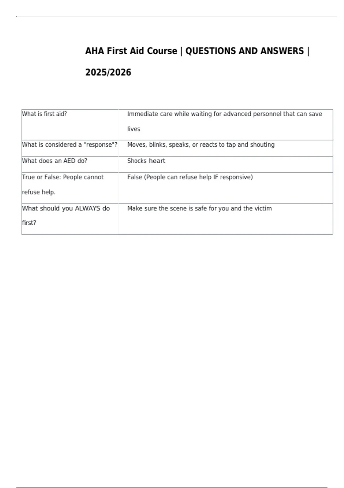 AHA First Aid Course | QUESTIONS AND ANSWERS | 2025/2026