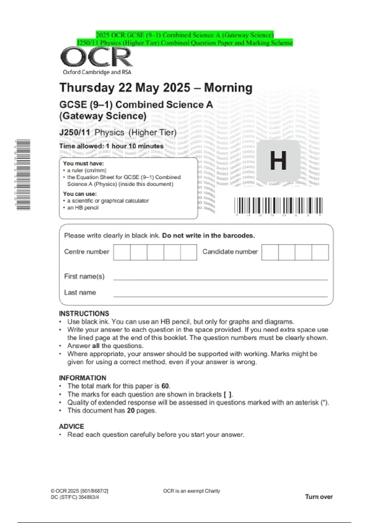 2025 OCR GCSE (9–1) Combined Science A (Gateway Science) J250/11 Physics (Higher Tier) Combined Question Paper and Marking Scheme