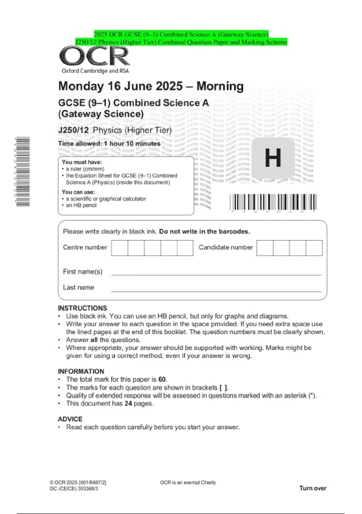 2025 OCR GCSE (9–1) Combined Science A (Gateway Science) J250/12 Physics (Higher Tier) Combined Question Paper and Marking Scheme