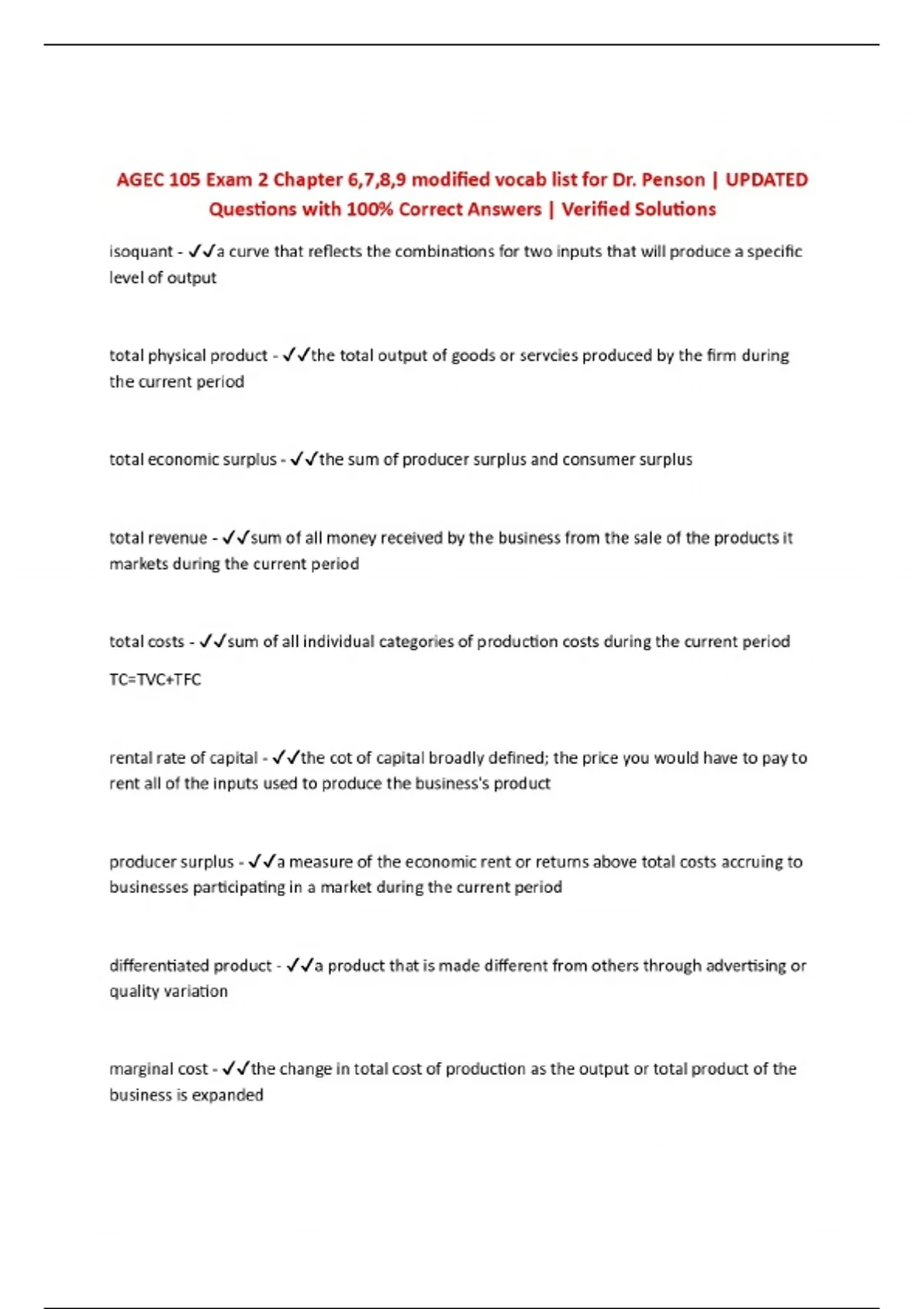 AGEC 105 Exam 2 Chapter 6,7,8,9 modified vocab list for Dr. Penson | UPDATED Questions with 100% Correct Answers | Verified Solutions
