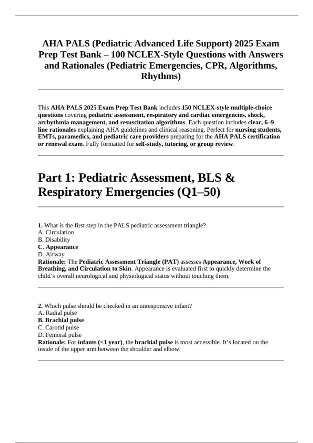 This AHA PALS 2025 Exam Prep Test Bank includes 150 NCLEX-style multiple-choice