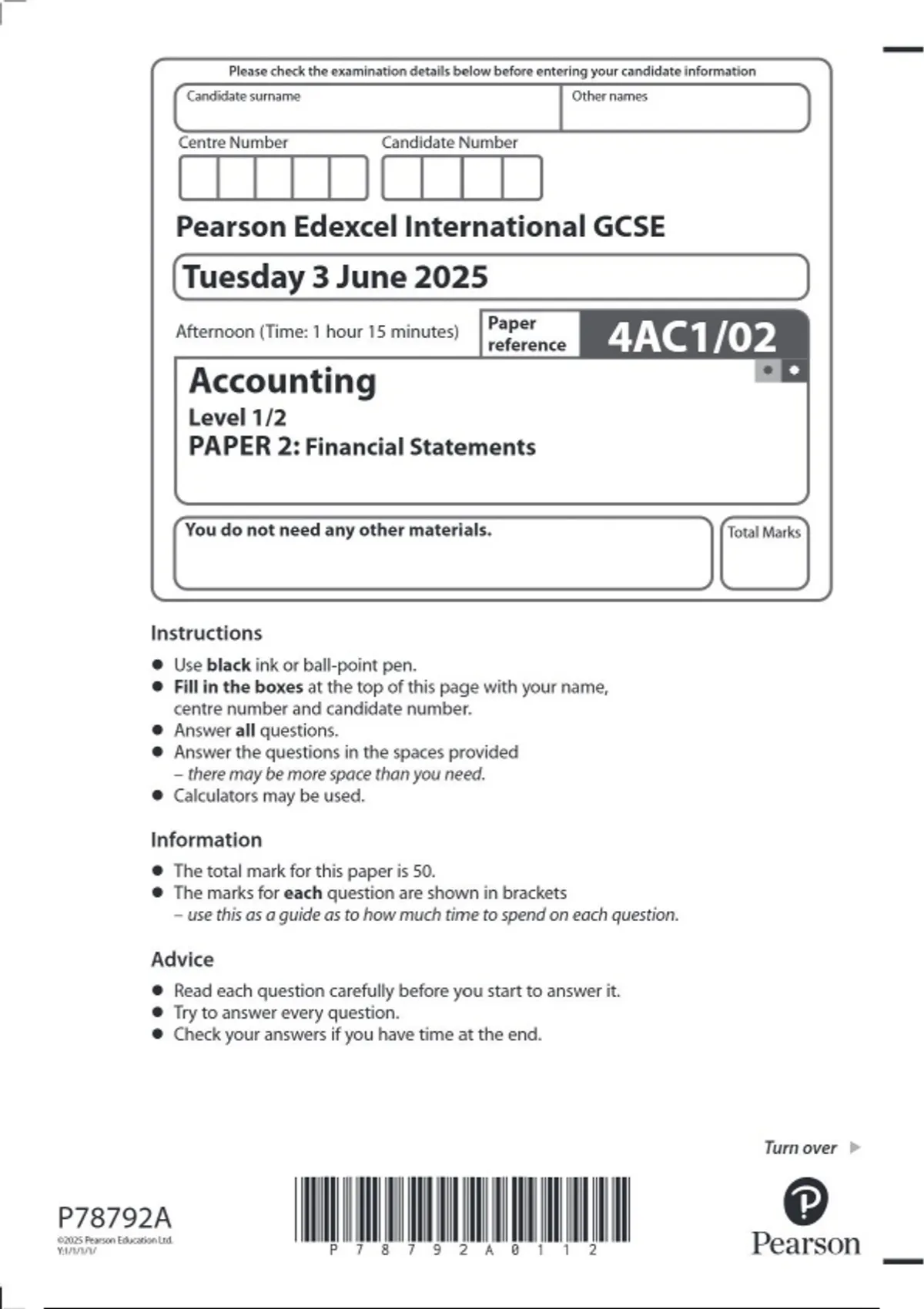 Pearson Edexcel IGCSE Accounting Level 1/2 PAPER 2 (4AC1/02) JUNE 2025 QUESTION PAPER: Financial Statements
